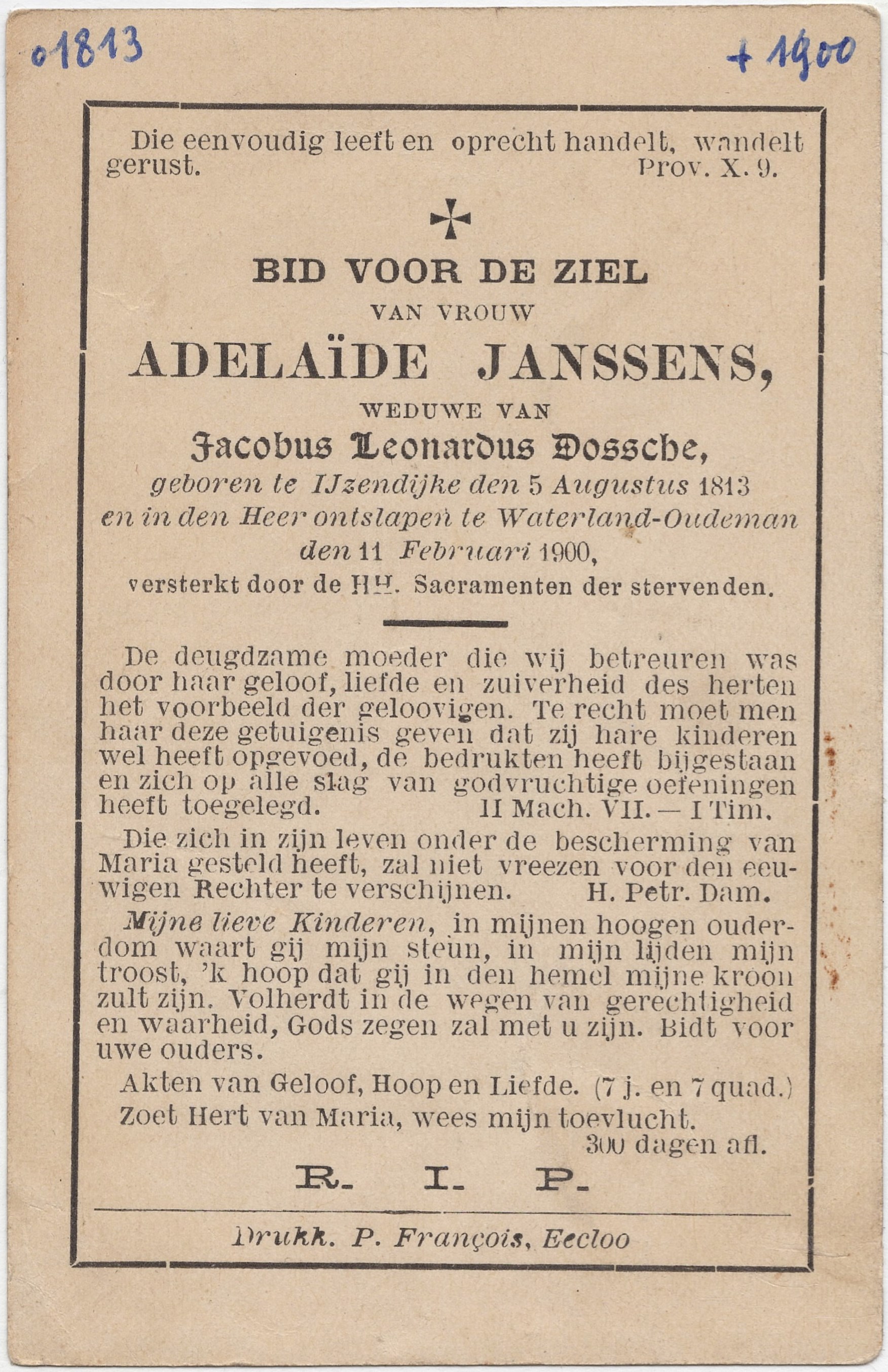 Janssens, Adelaïde (Ijzendijke 5/8/1813 - Waterland-Oudeman 11/2/1900) w.Jacobus Leonardus Dossche