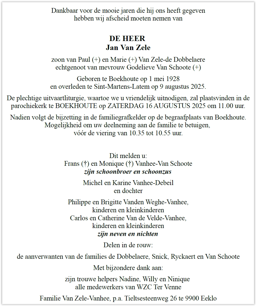 Van Zele, Jan (Boehoute 1/5/1928 - St-Martens-Latem 16/8/2025) w. Van Schoote, Godelieve