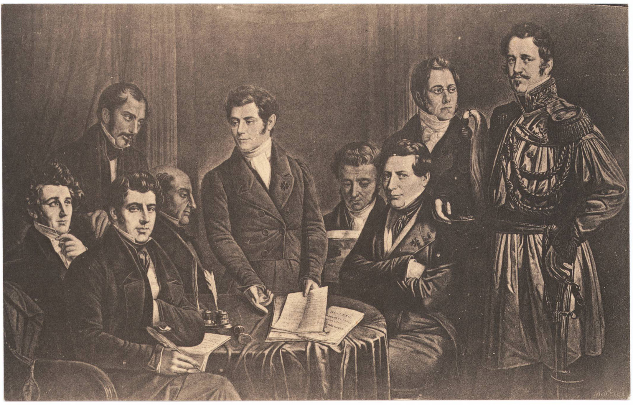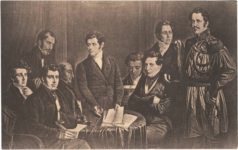 From left to right, seated, Alexandre Gendebien, Charles Rogier, Louis-Joseph de Potter,