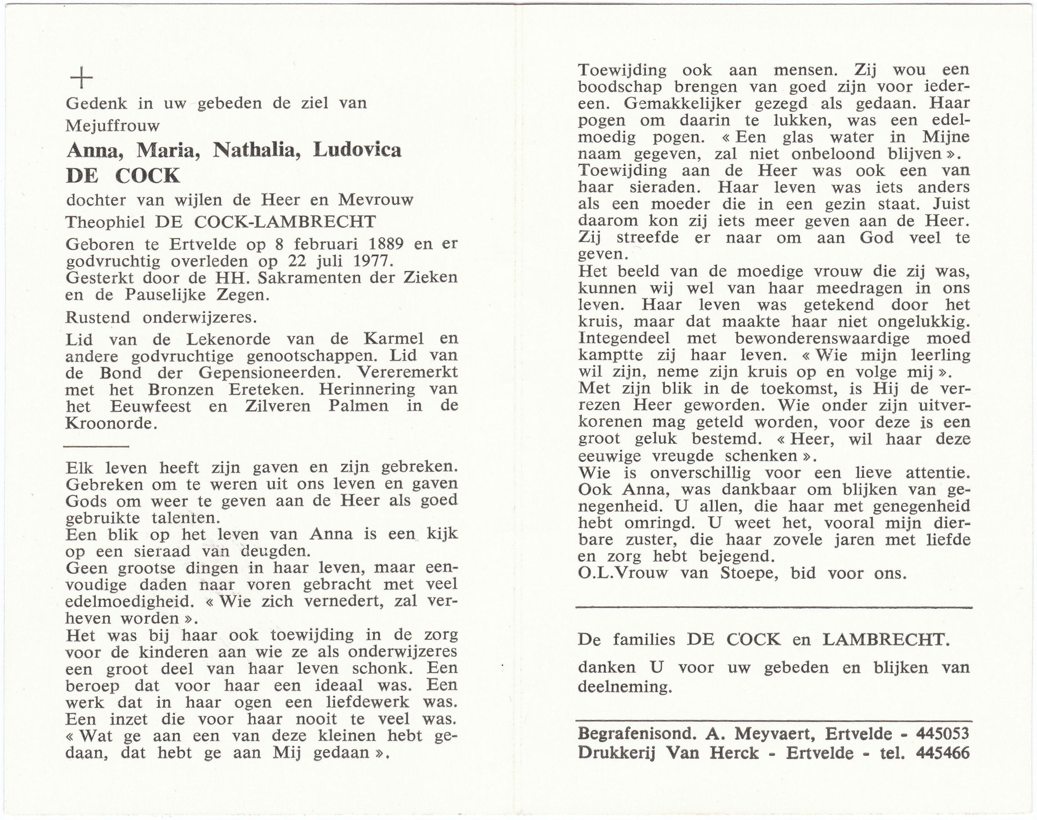 dochter van wijlen de Heer en Mevrouw Theophiel De Cock-Lambrecht