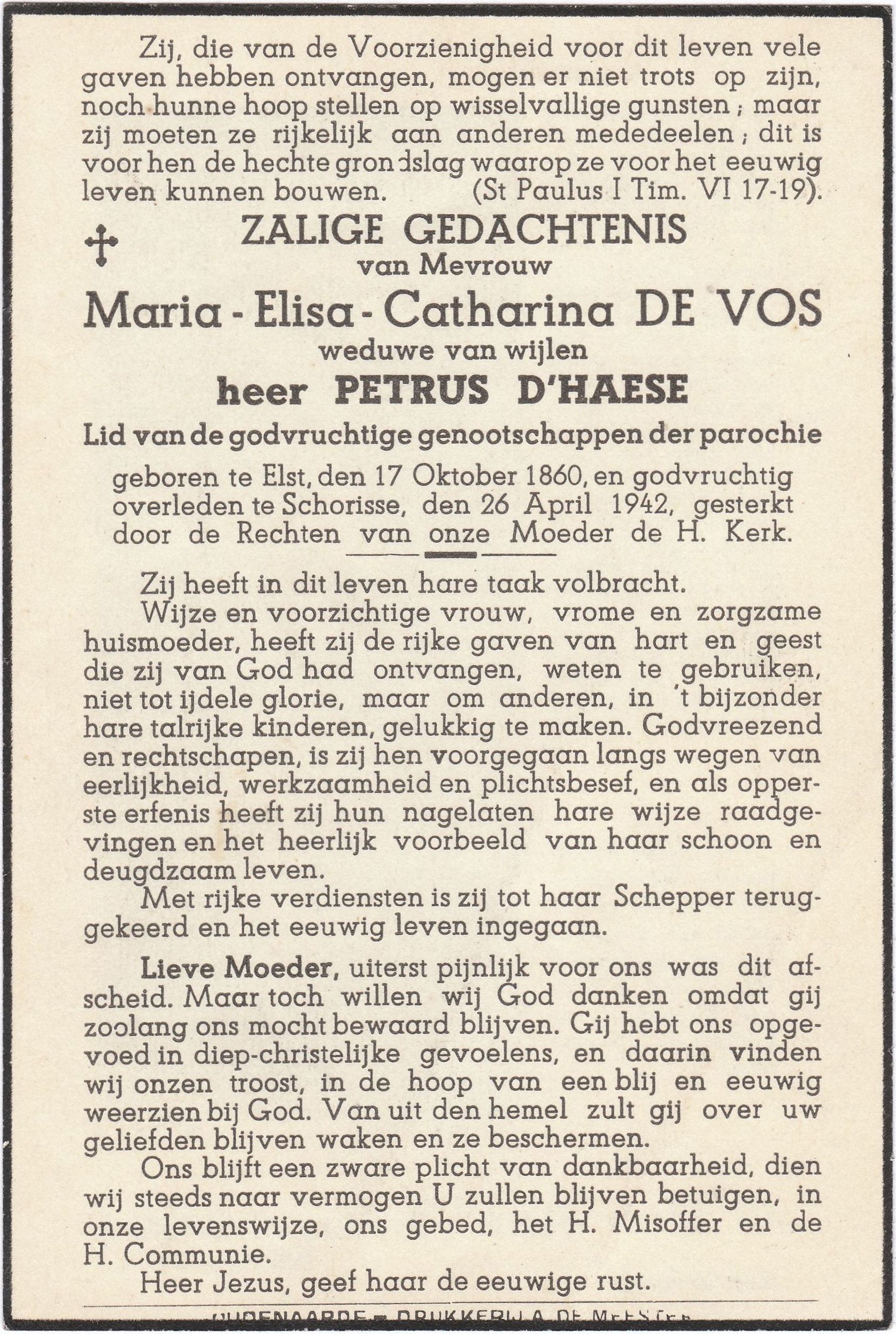 en godvruchtig overleden te Schorisse, den 26 April 1942.