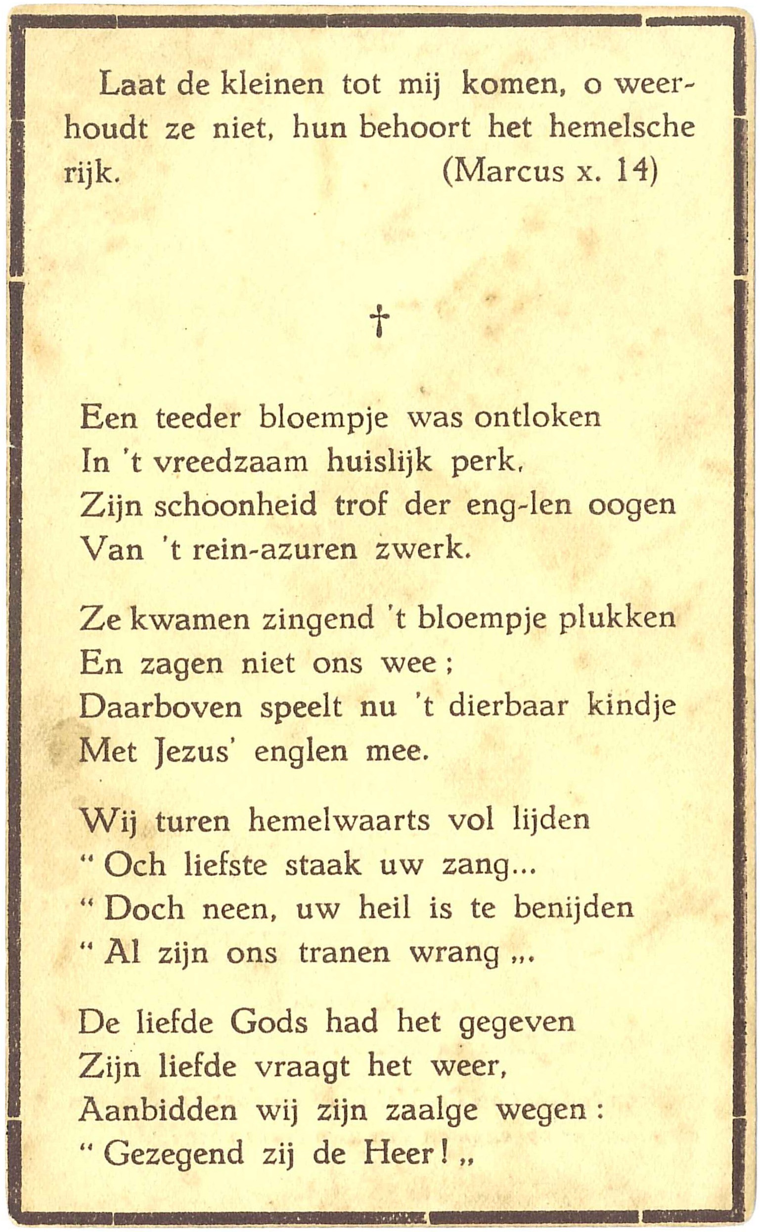 door God in zijn engelenkoor opgenomen den 27n November 1929.
