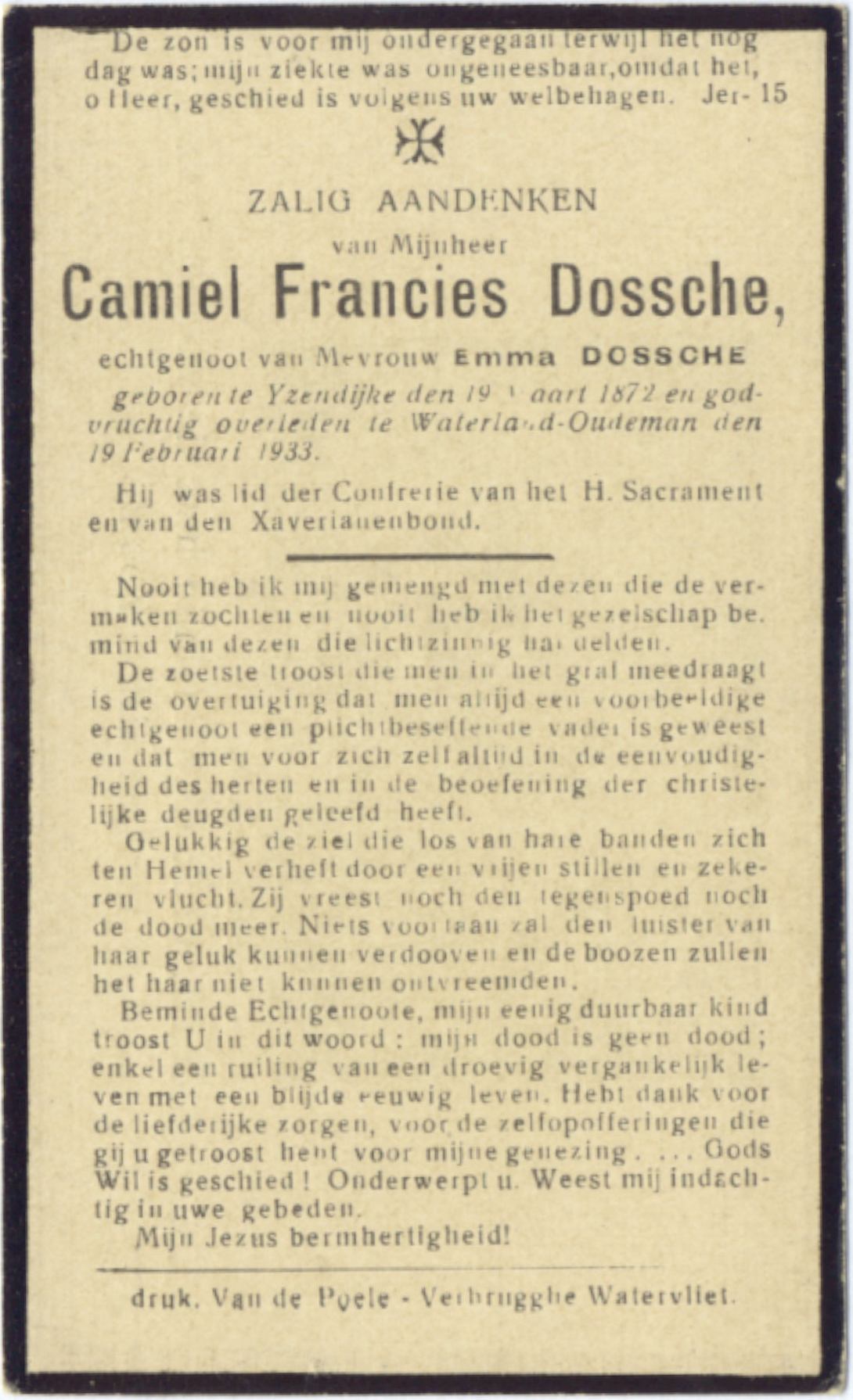 en godvruchtig overleden te Waterland-Oudeman de 19 Februari 1933.