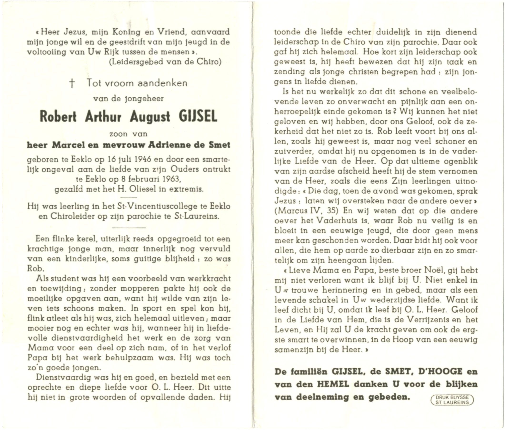 door een smartelijk ongeval aan de liefde van zijn Ouders ontrukt te Eeklo op 8 februari 1963.