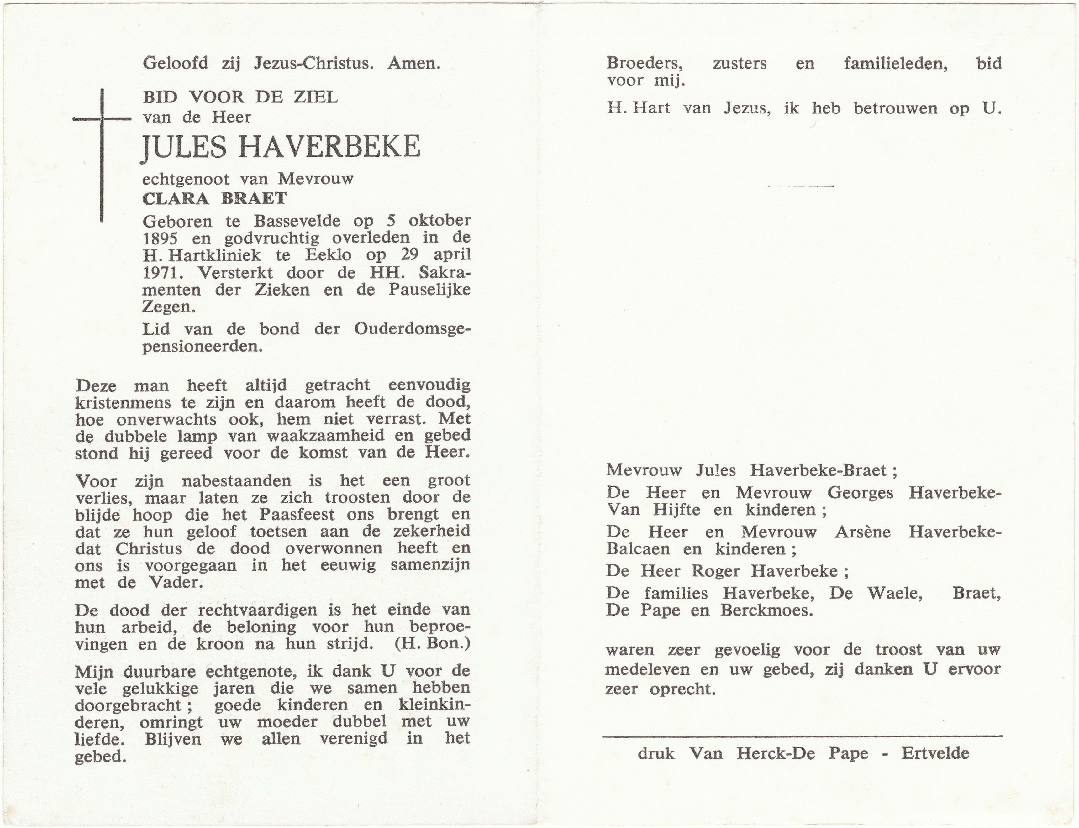 godvruchtig overleden in de H. Harkliniek te Eeklo op 29 april 1971.