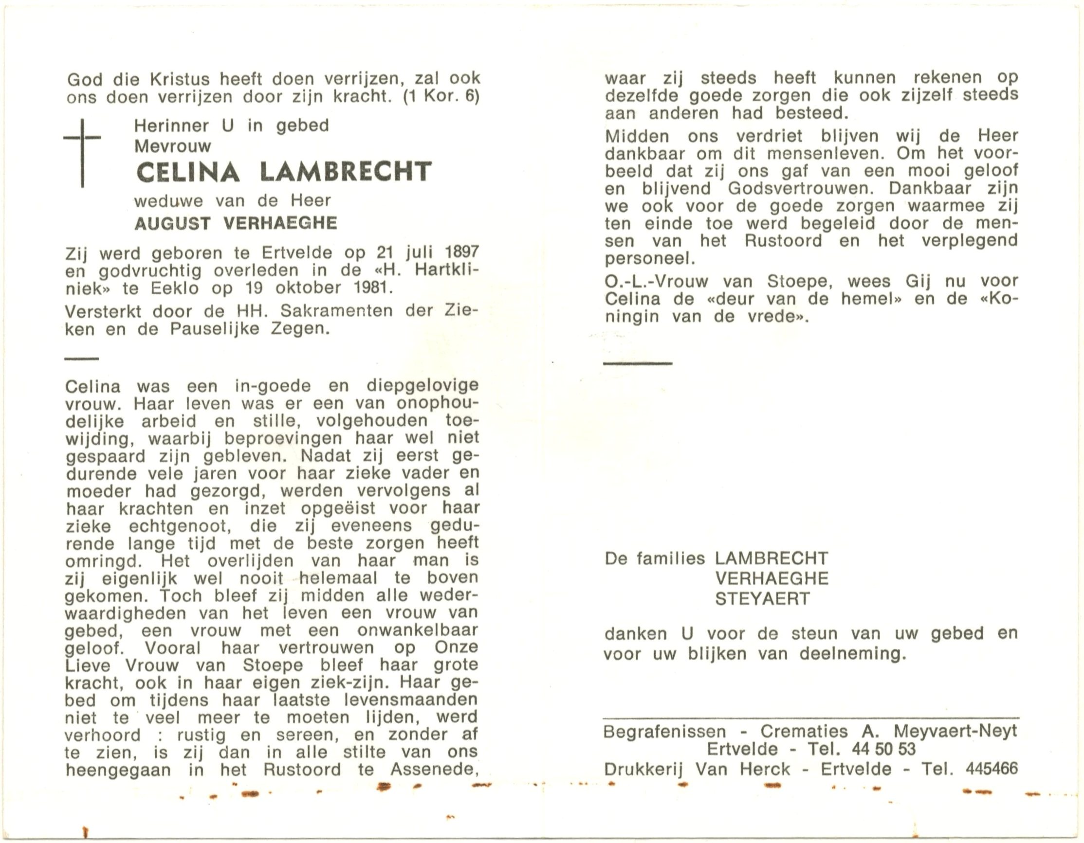 en godvruchtig overleden in de «H. Hart Klinik» te Eeklo op 19 oktober 1981.