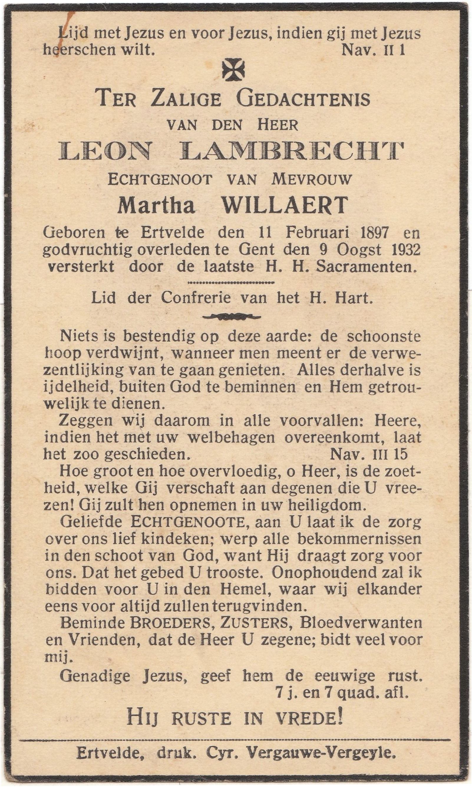 godvruchtig overleden te Gent den 9 Oogst 1932.