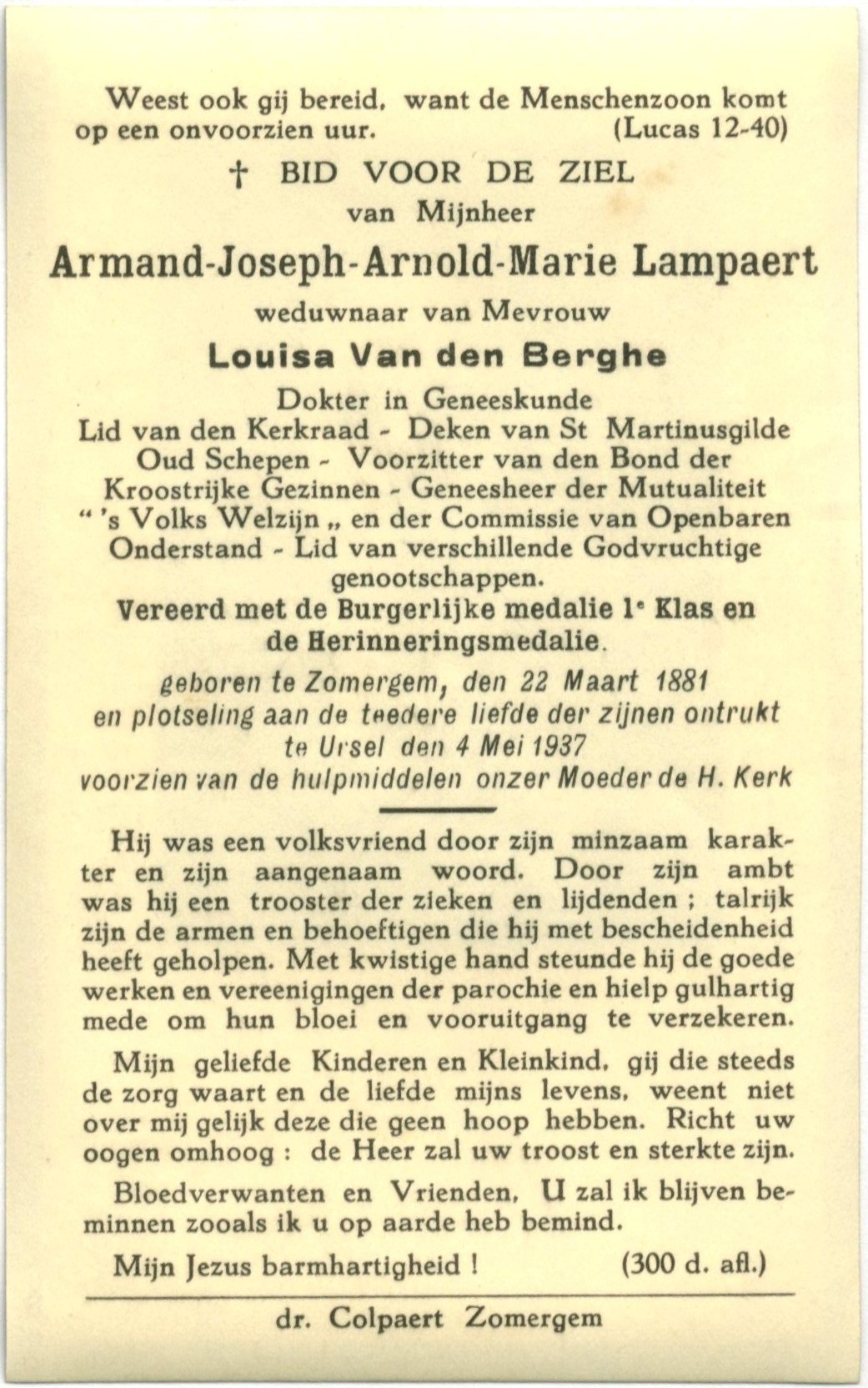 en plotseling aan de tedere liefde der zijnen ontrukt te Ursel den 4 Mei 1937.