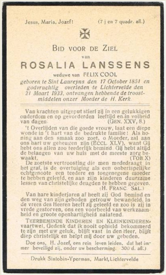 godvruchtig overleden te Lichtervelde den 21 Maart 1933,