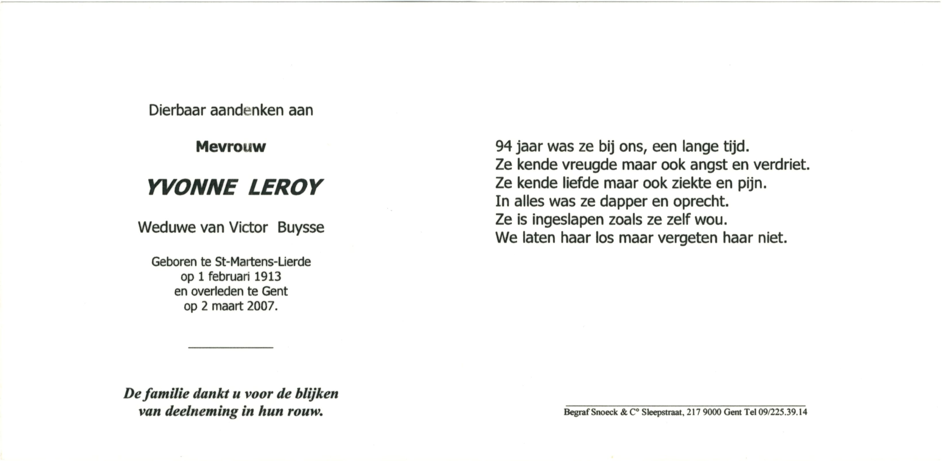 Onze beste dank voor dit aandenken aan Mevr. Leon Lambrecht, née Agnes De Clerck.