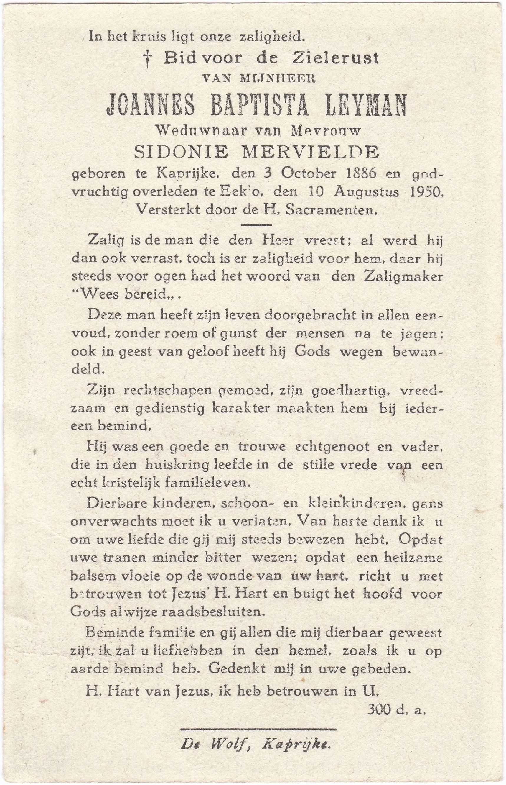 godvruchtig overleden te Eeklo, den 10 Augustus 1950.