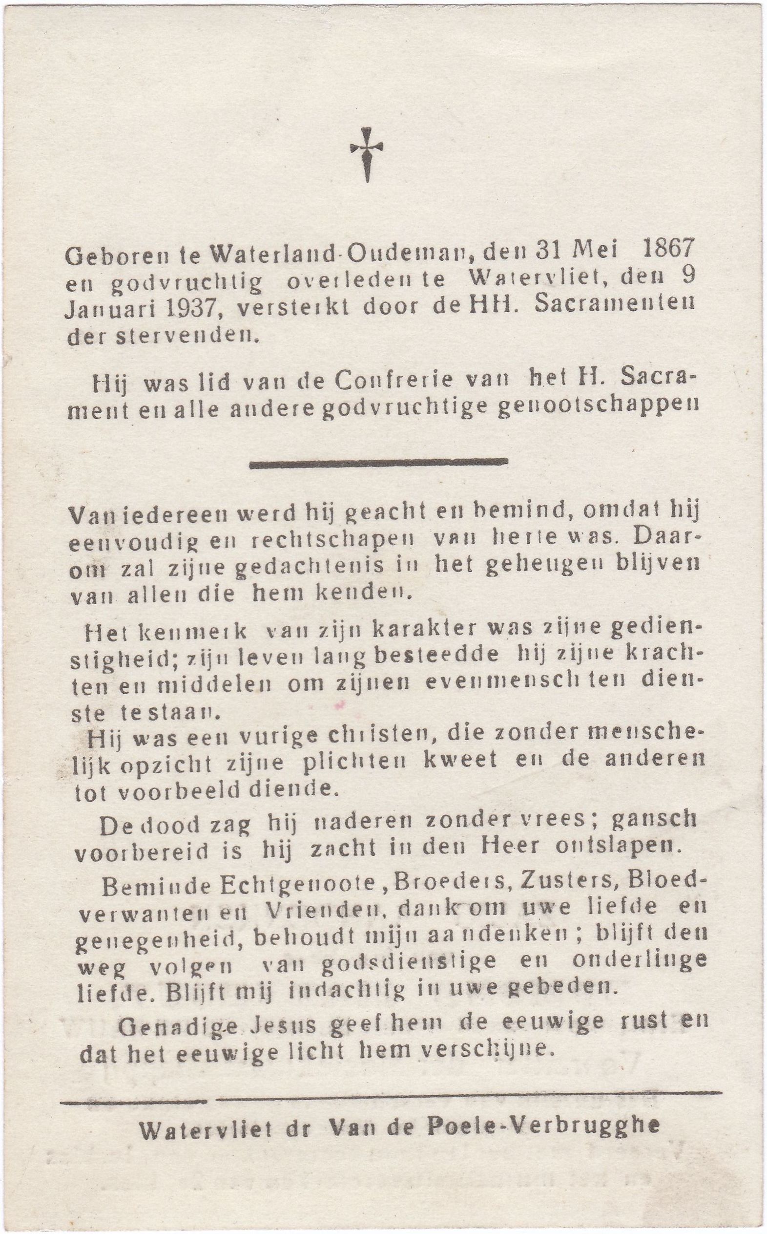 en godvruchtig overleden te Watervliet, den 9 Januari 1937.