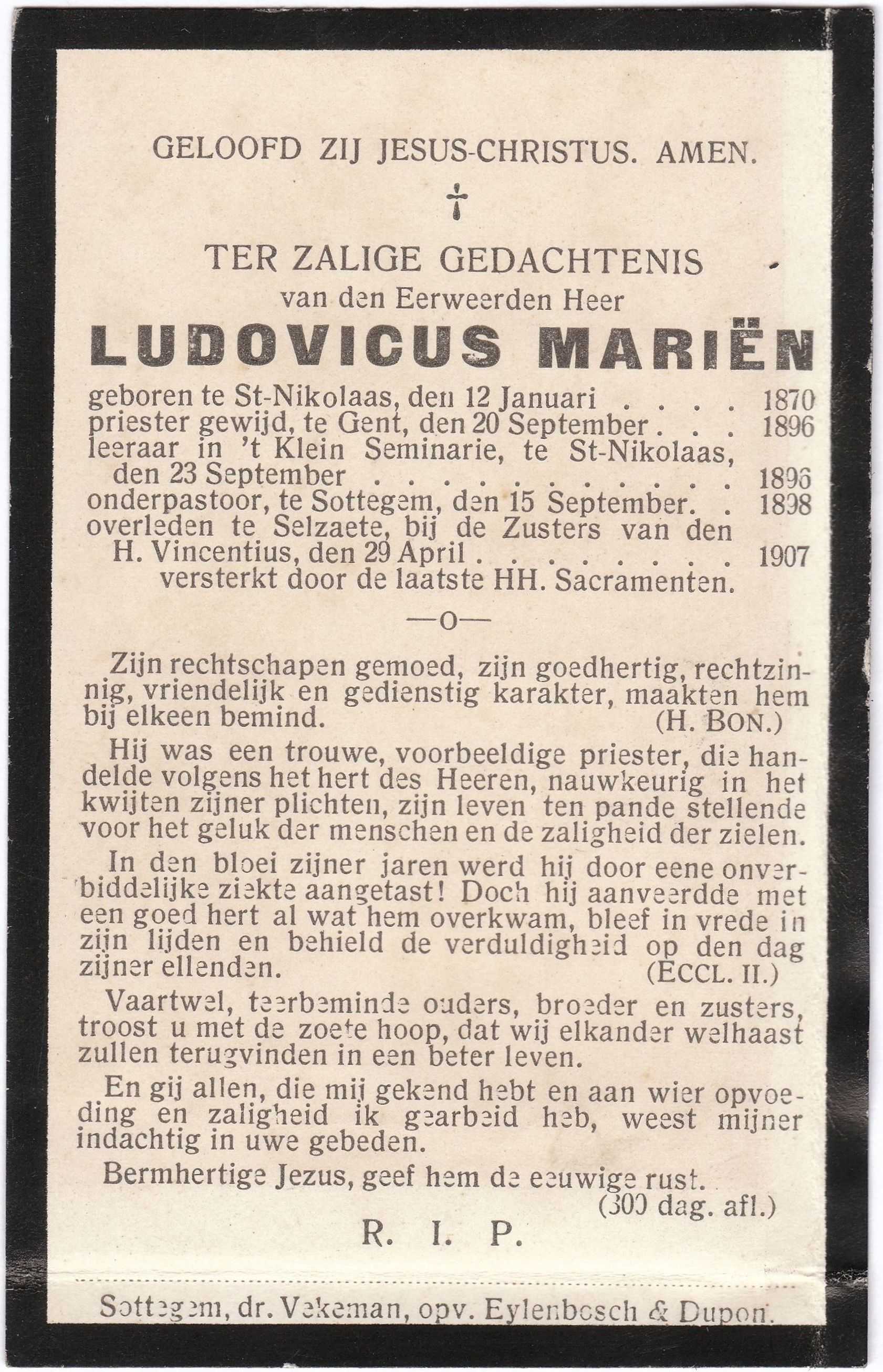 overleden te Selzaete, bij de Zusters van den H. Vincentius, den 29 April 1907.
