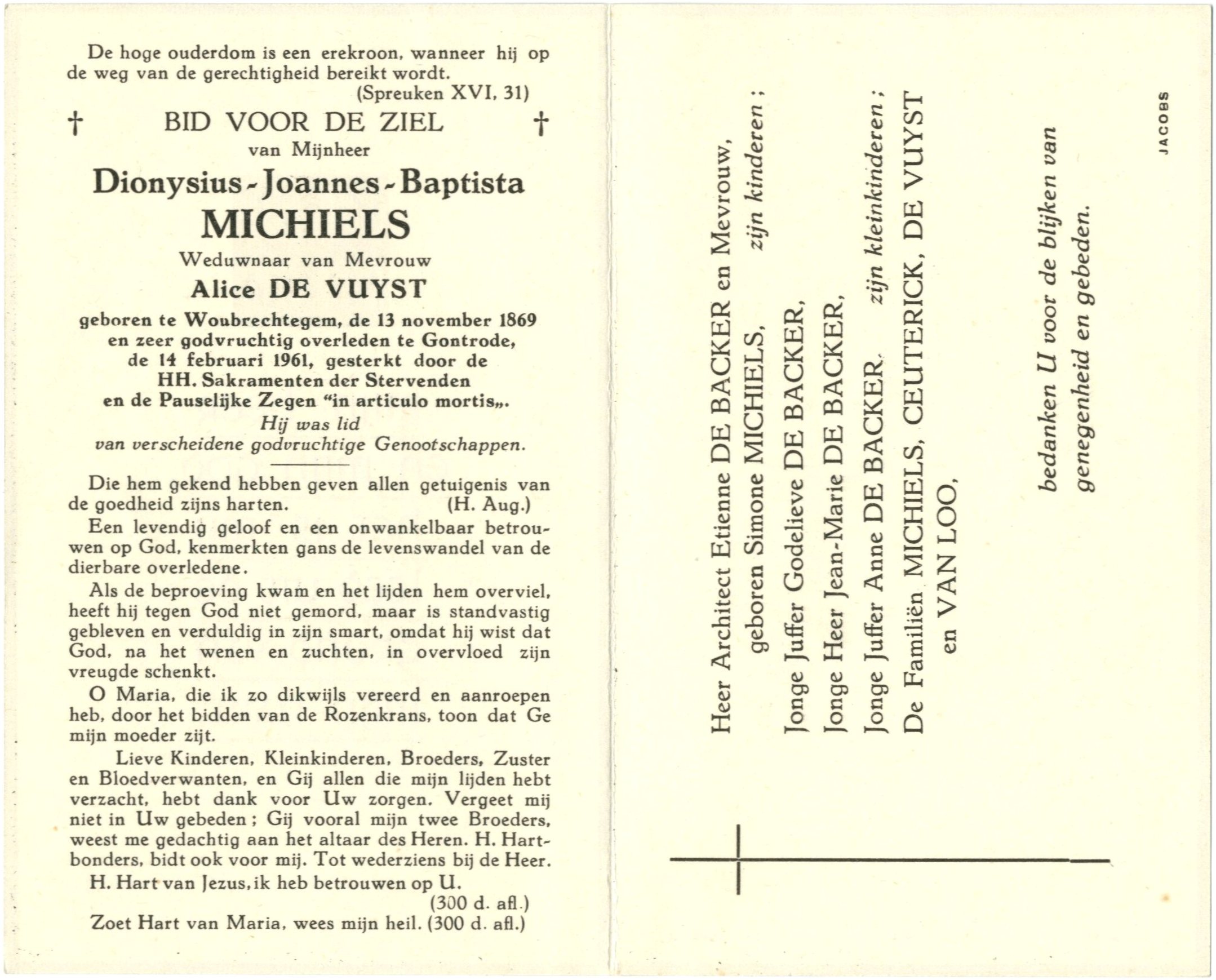 en zeer godvruchtig overleden te Gontrode de 14 februari 1961