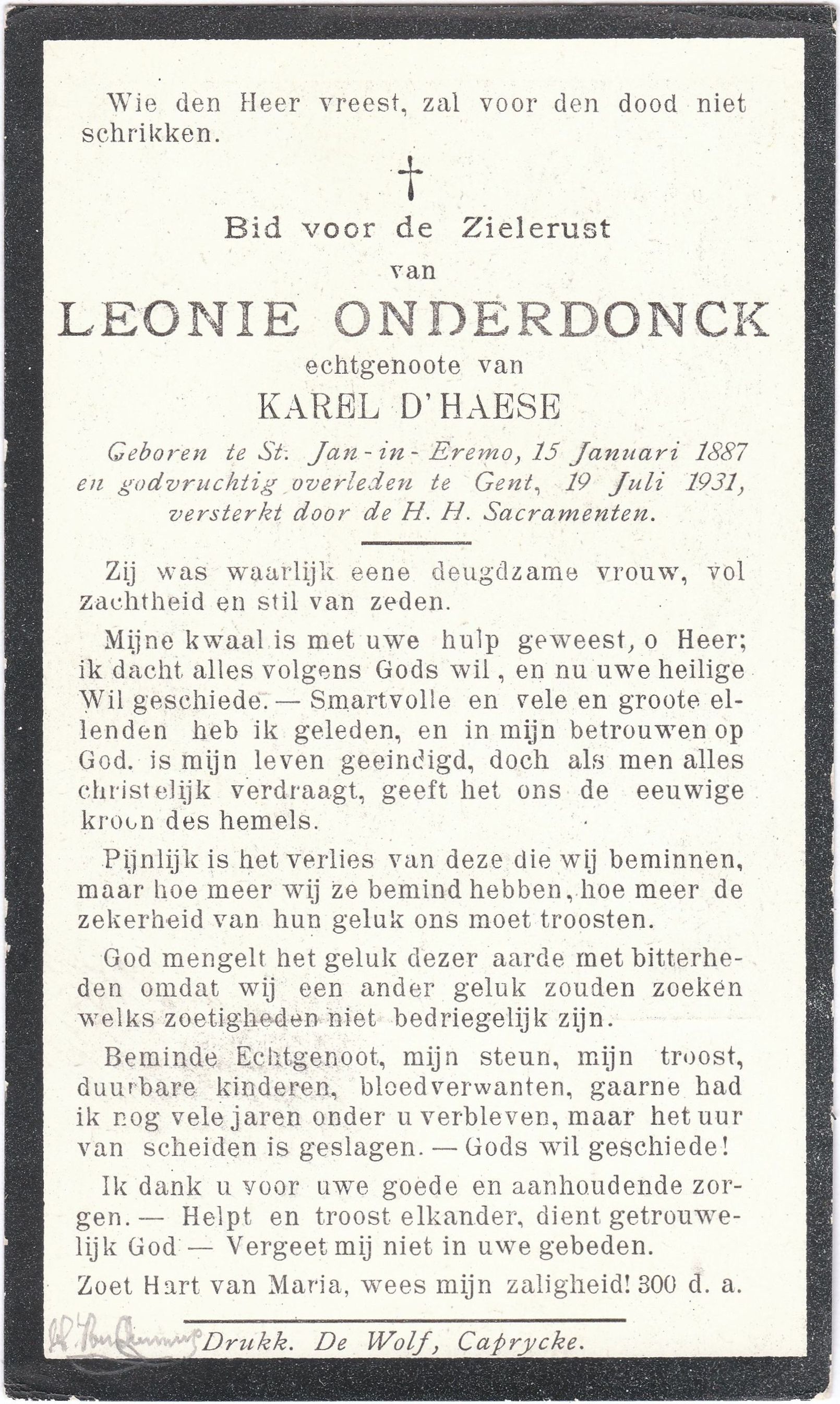 en godvruchtig overleden te Gent, 19 Juli 1931.