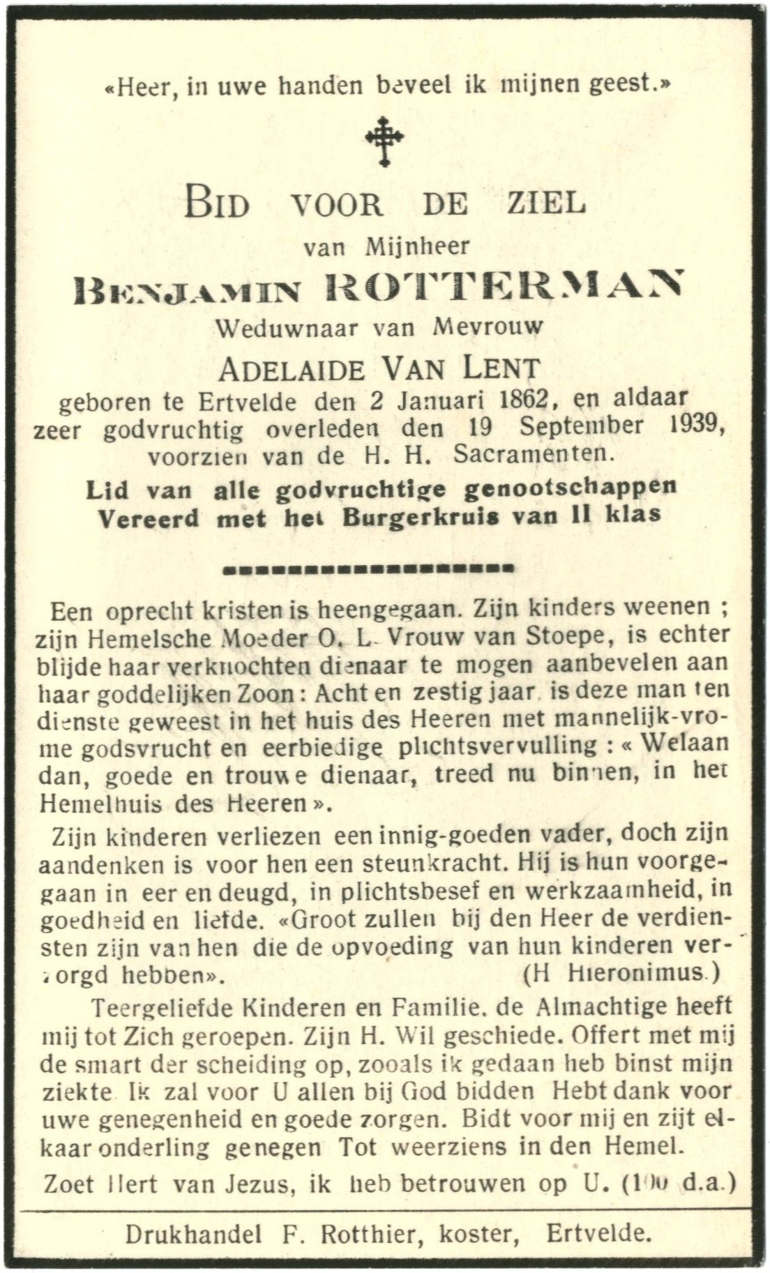 Onze beste dank voor dit aandenken aan Mevr. Firmin Rotterman, née Celina Lambrecht.