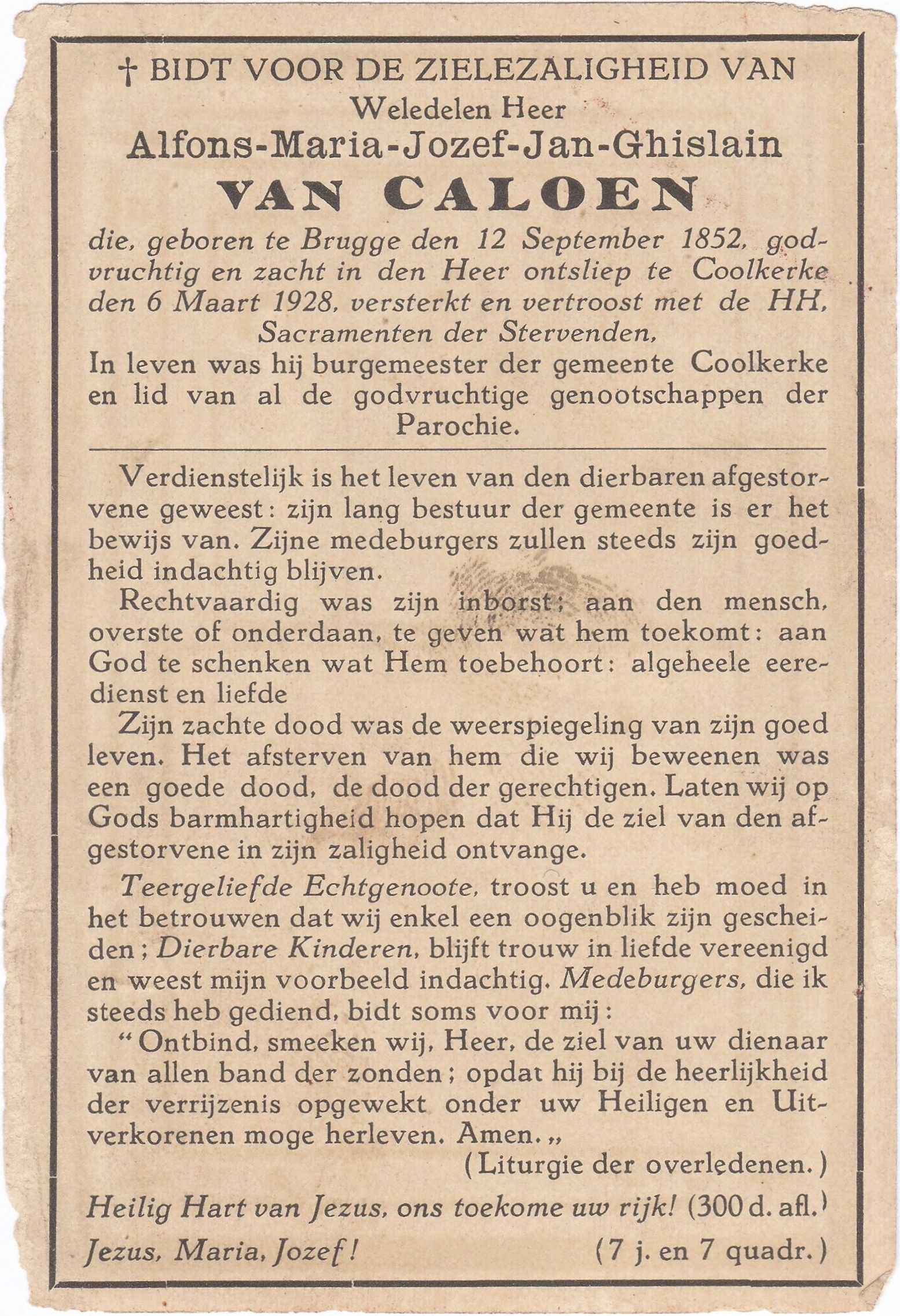 Bidt voor de zielezaligheid van Weledelen Heer Alfons Maria Jozef Jan Ghislain Van Caloen