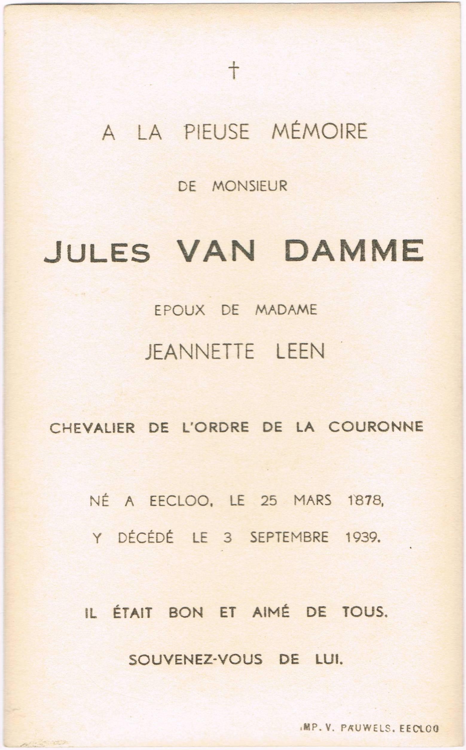Epoux de Madame Jeannette LeenChevalier de l'Ordre de la CouronneNé à Eecloo, le 25 mars 1878y décédé le 3 Septembre 1939.