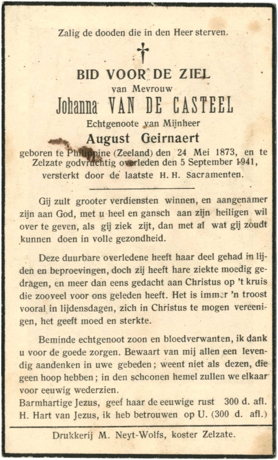 en te Zelzate godvruchtig overleden den 5 September 1941.