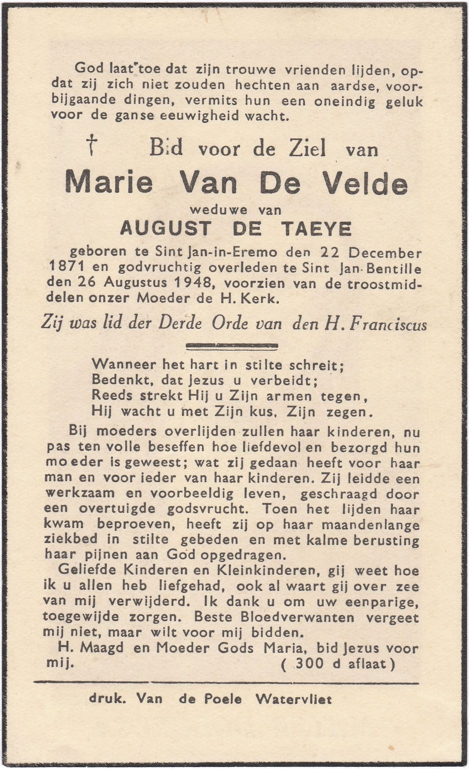 godvruchtig overleden te Sint Jan-Bentille den 26 Augustus 1948.