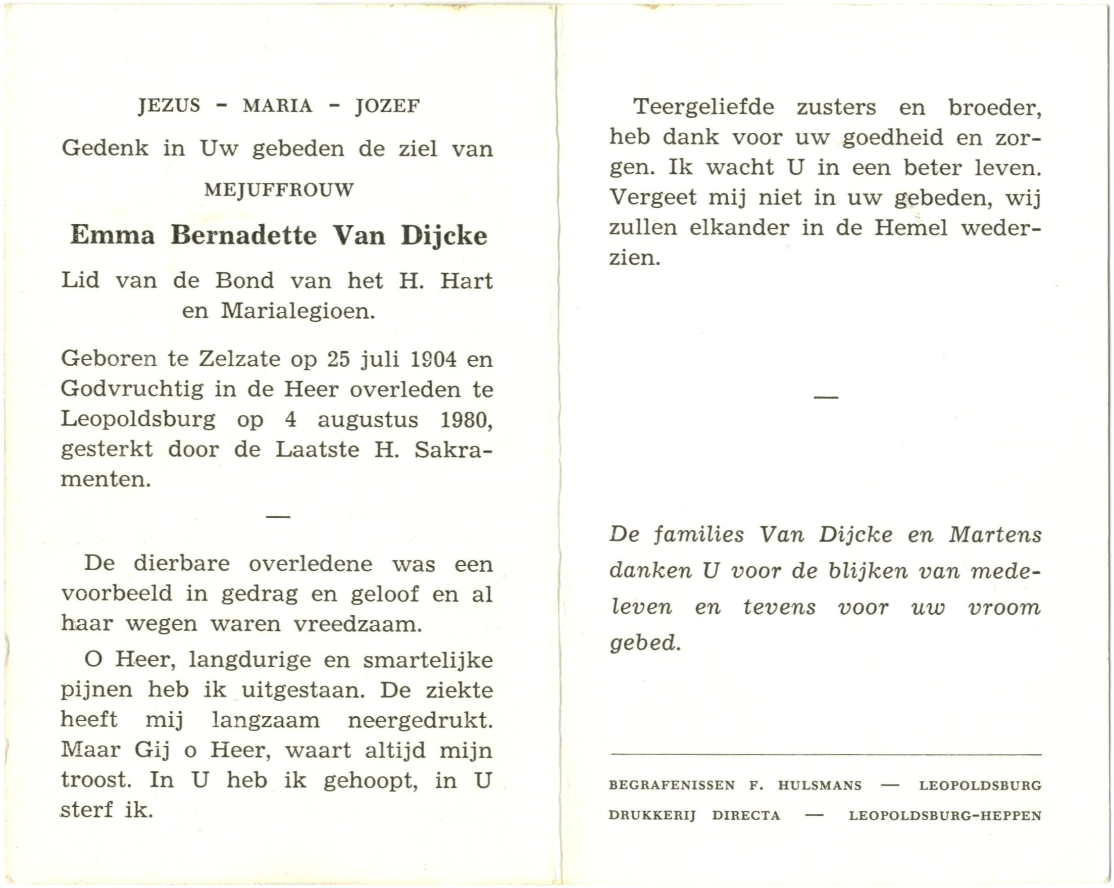 Godvruchtig in de Heer overleden te Leopoldsburg op 4 augustus 1980.