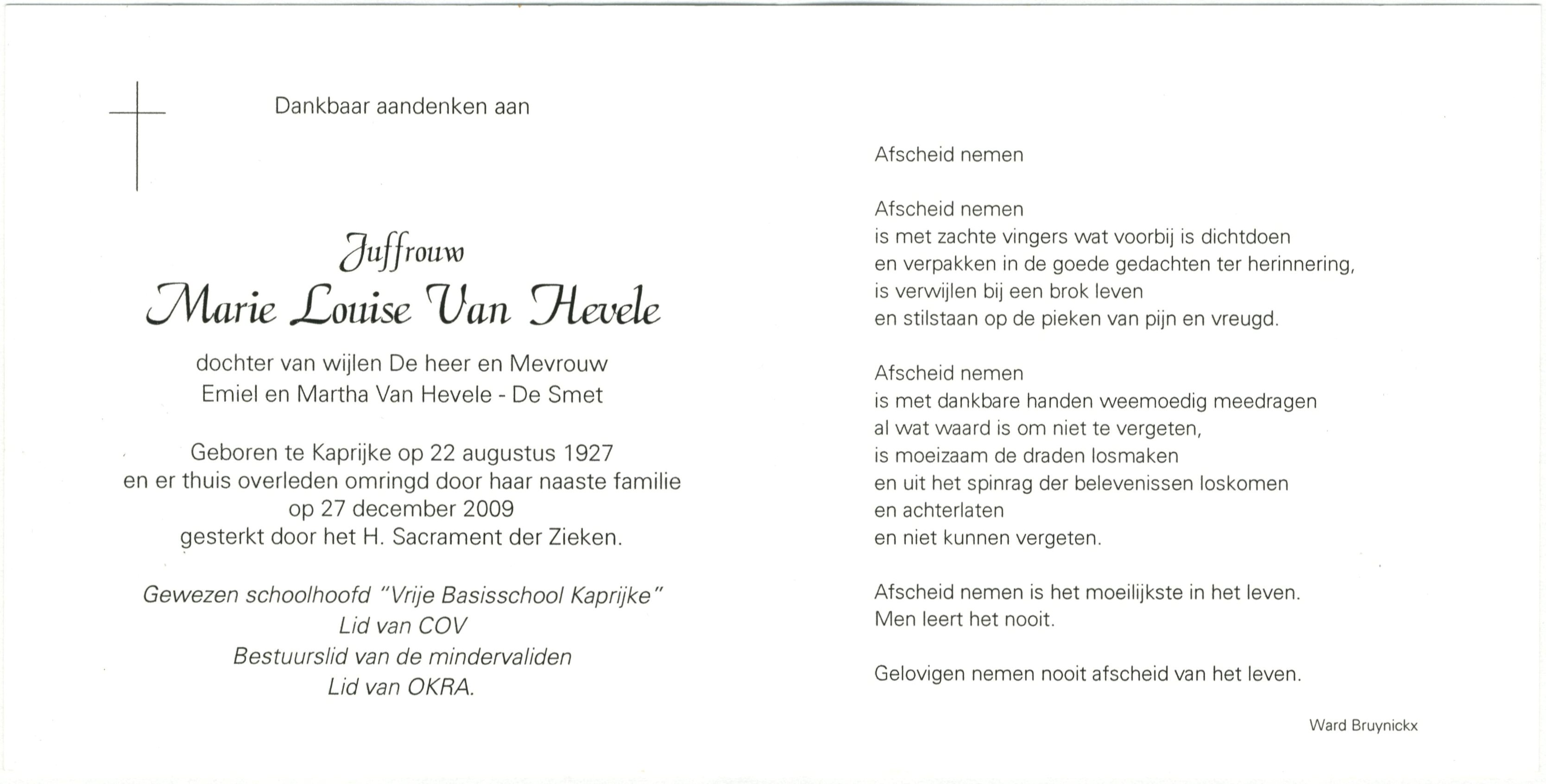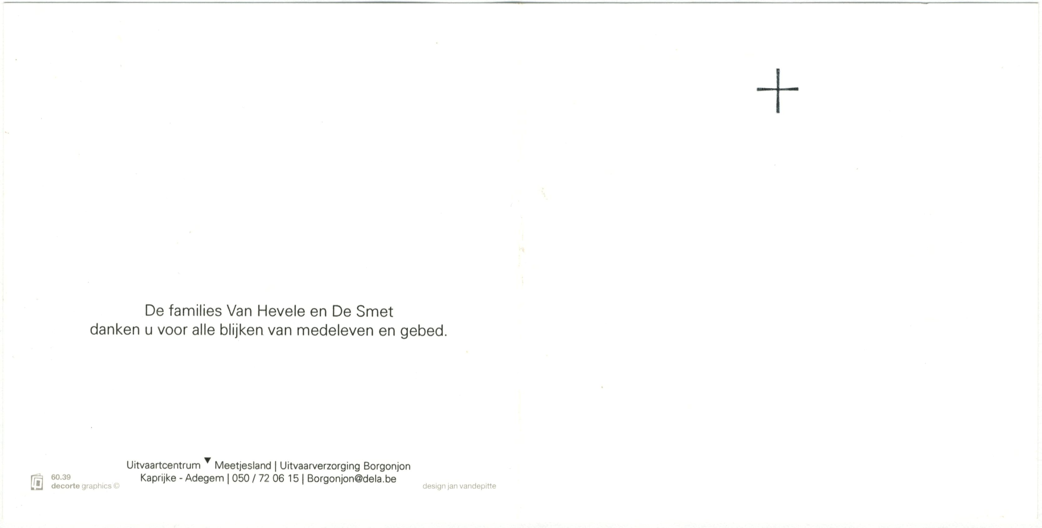 dochter van wijlen de heer en Mevrouw Emiel Van Hevele en Martha De Smet