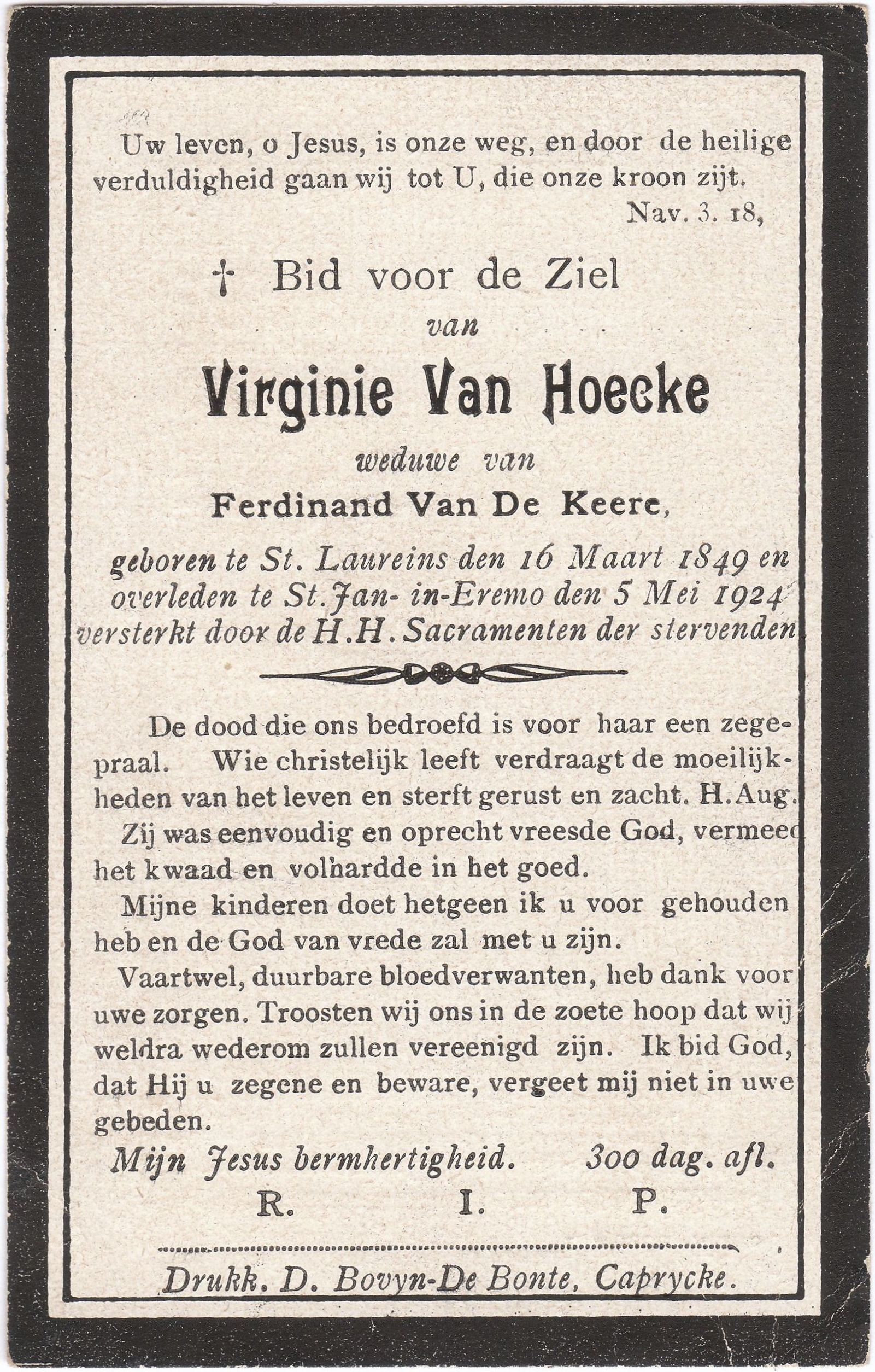 Onze beste dank voor dit aandenken aan Mevr. Hubert Dusarduyn, née Marie-Aimée Van Damme.