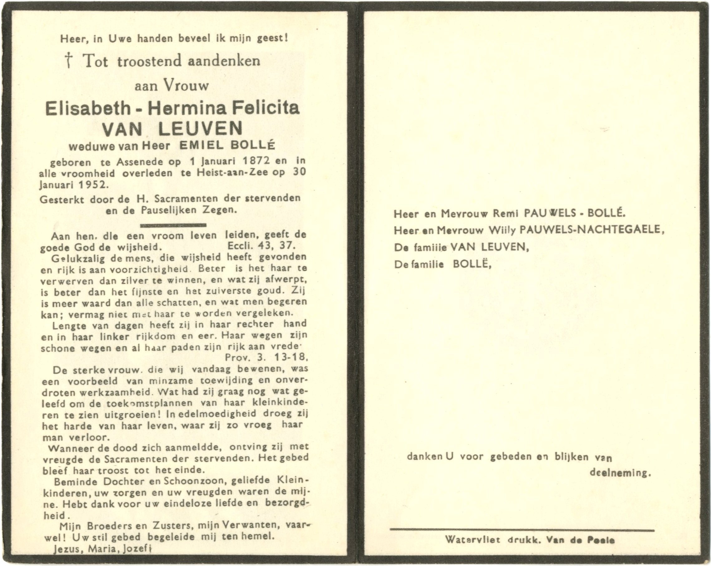 in alle vroomheid overleden te Heist-aan-Zee op 30 januari 1952.