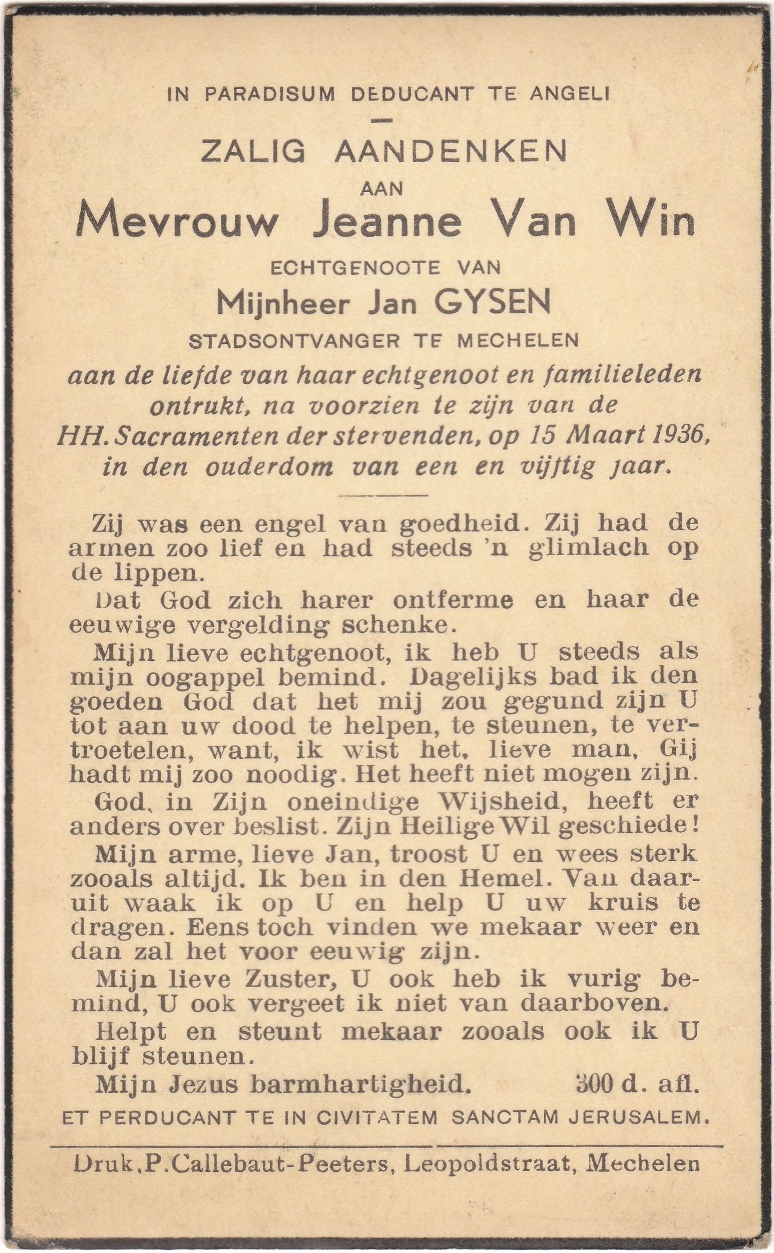 na voorzien te zijn van de HH Sacramenten der stervenden, op 15 Maart 1936,in den ouderdom van een en vijftig jaar.