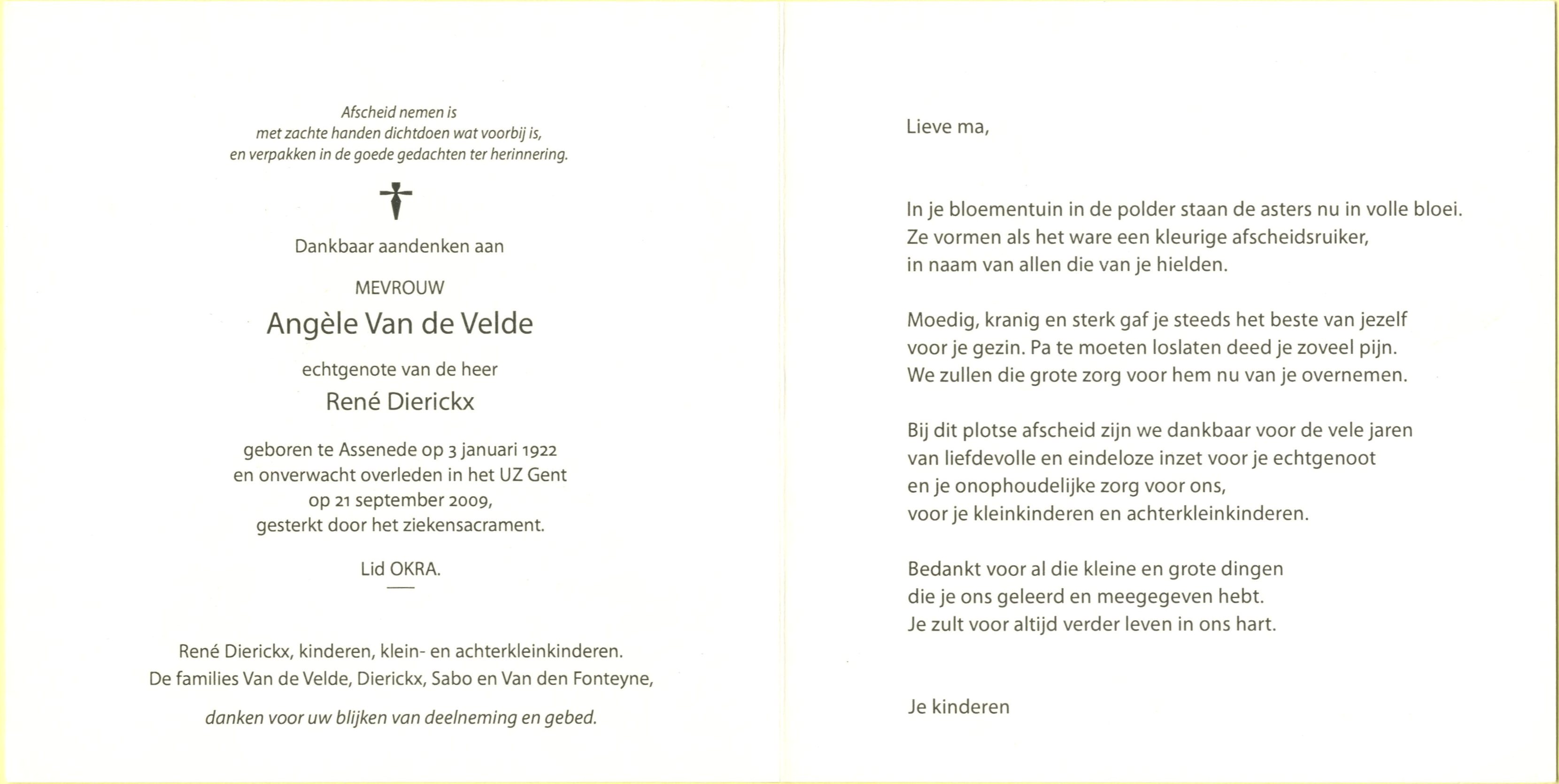 Onze beste dank voor dit aandenken aan Mevr. Leon Lambrecht, née Agnes De Clerck.