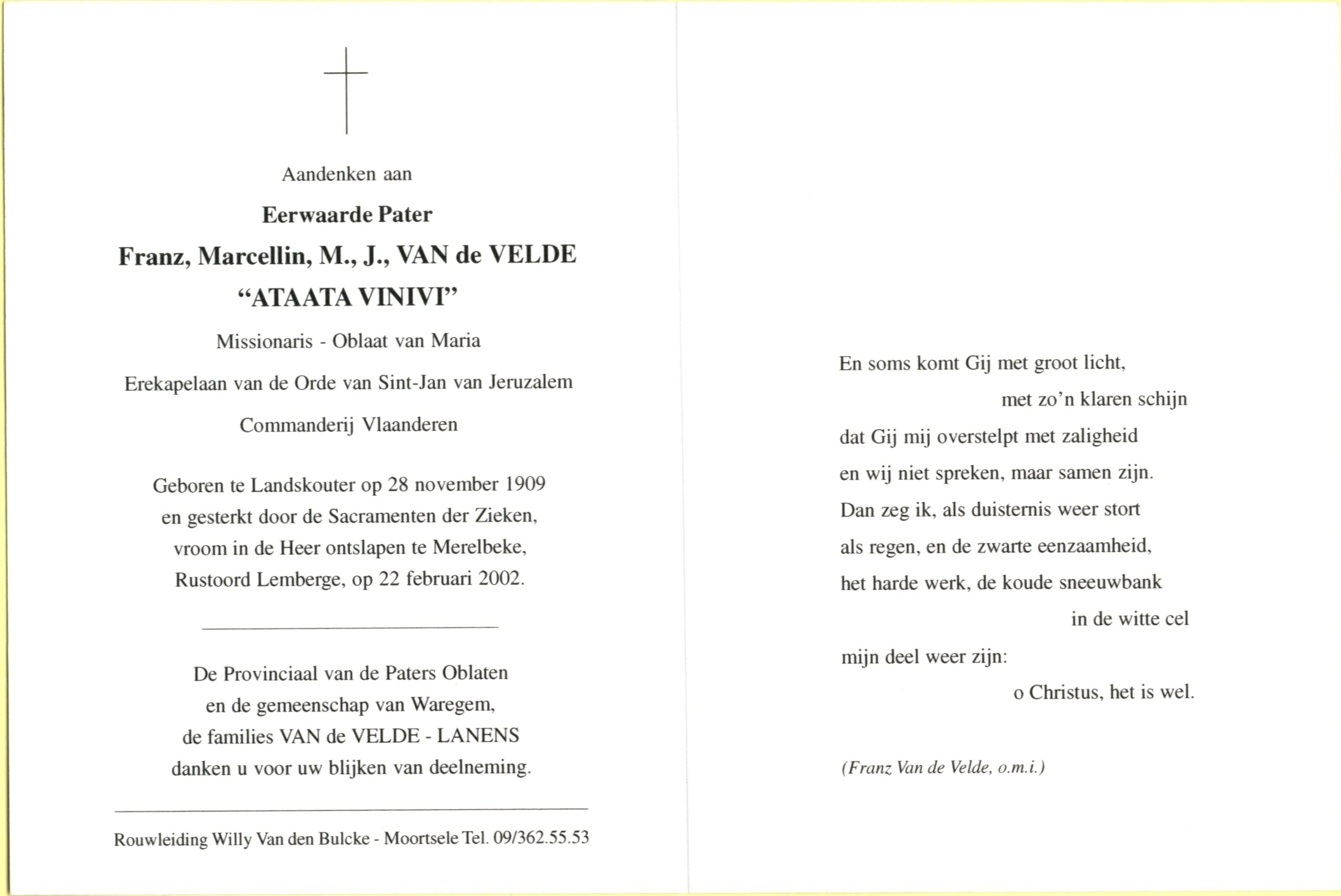 Eerwaarde Pater Franz, Marcellin, M., J., VAN de VELDE