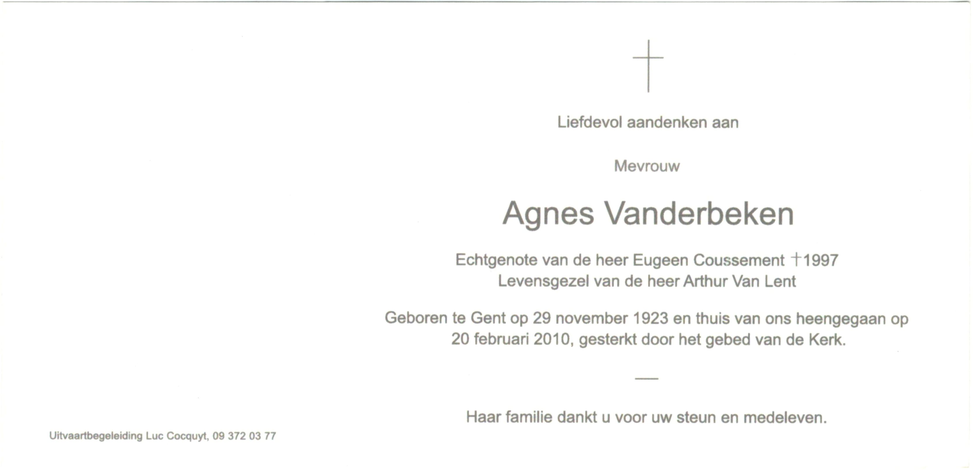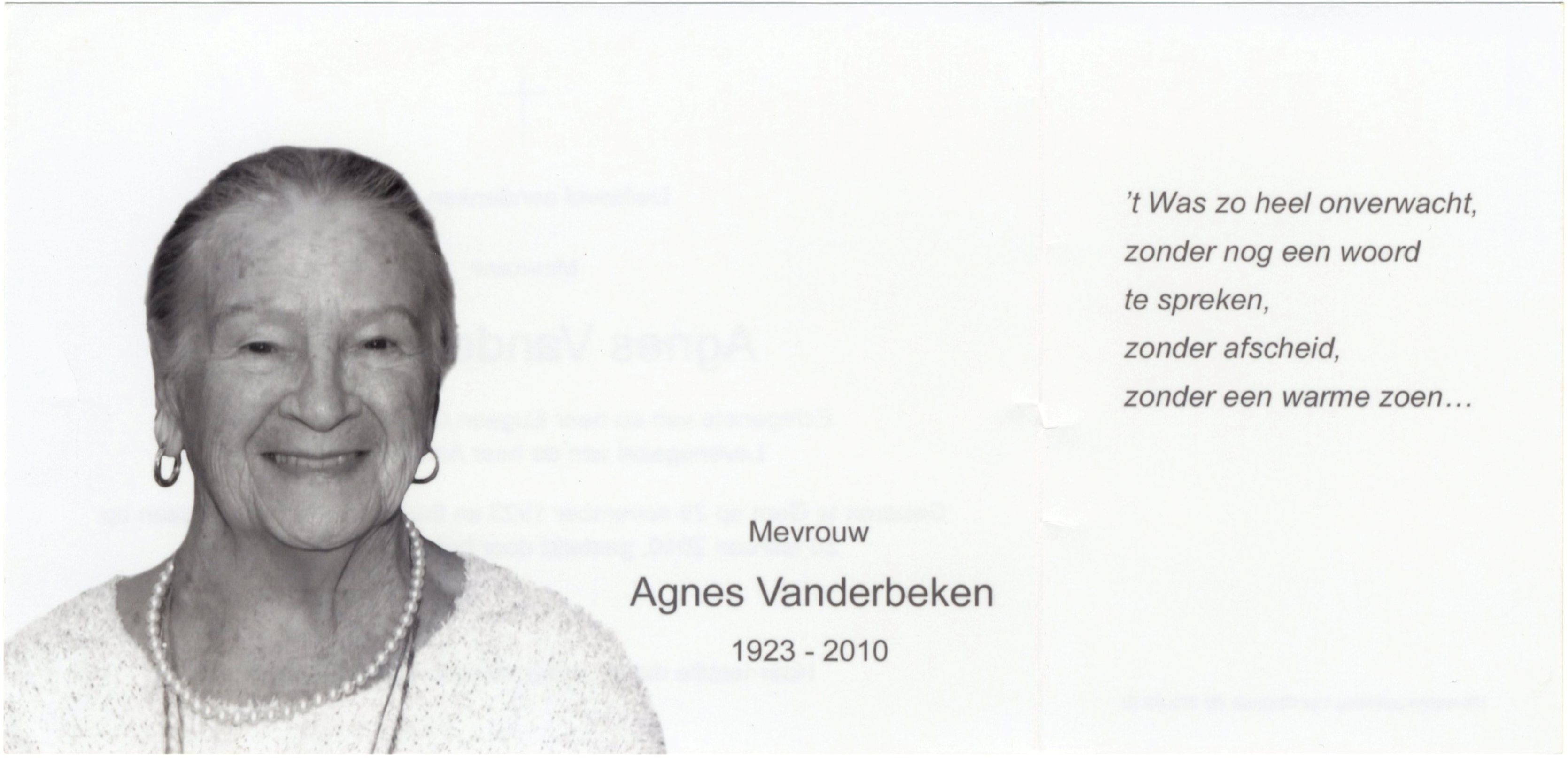 Onze beste dank voor dit aandenken aan Mevr. Leon Lambrecht, née Agnes De Clerck.