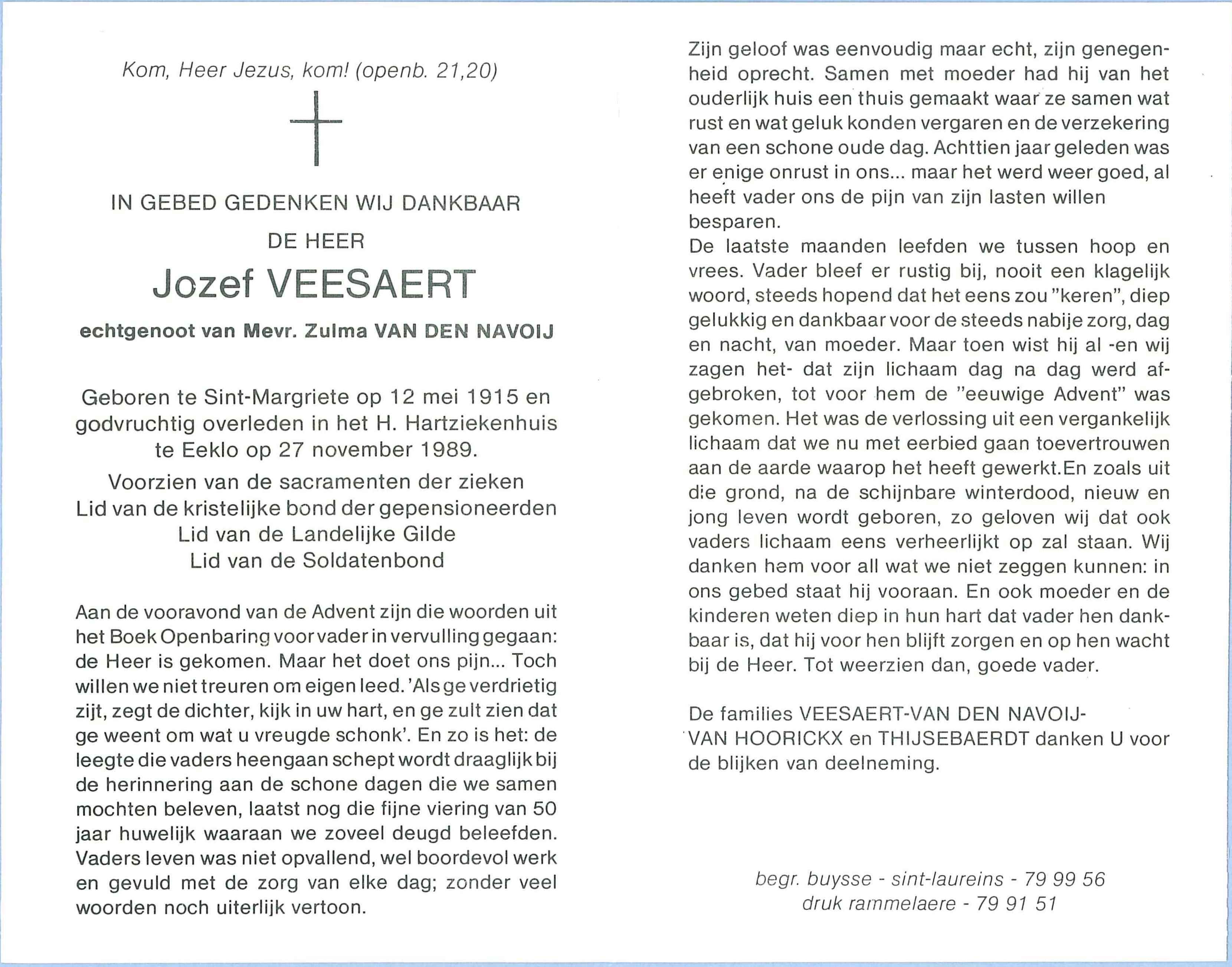 godvruchtig overleden in het H. Hartziekenhuis te Eeklo op 27 november 1989.