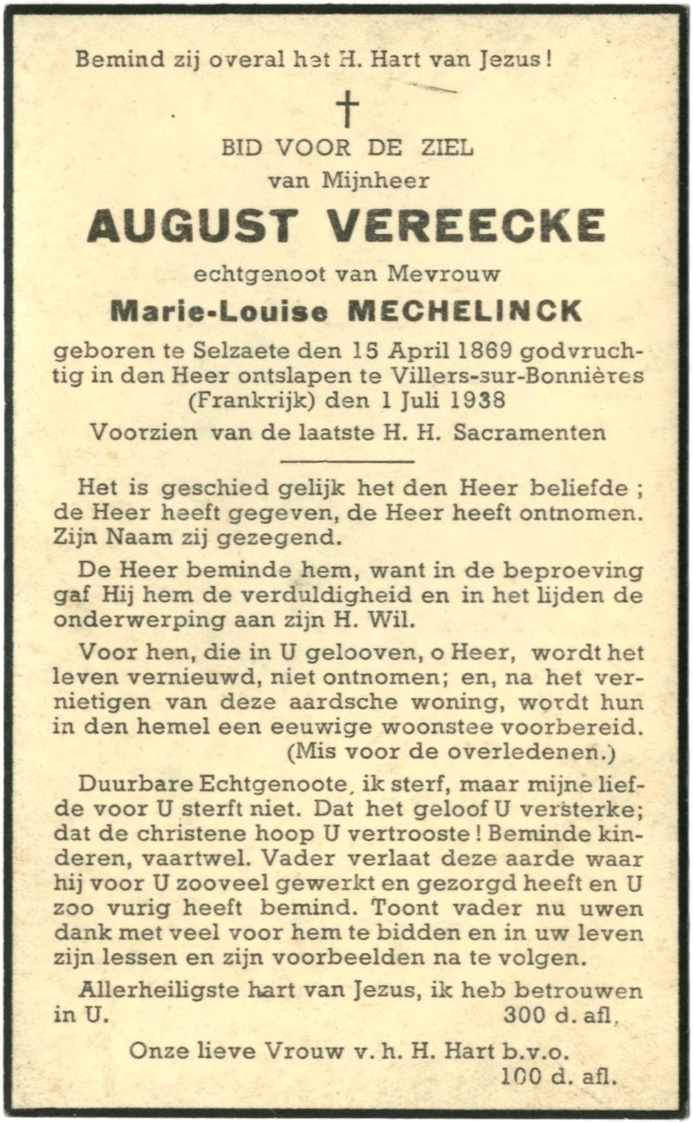 godvruchtig in den Heer ontslapen te Villers-sur-Bonnières (Frankrijk) den 1 Juli 1938.