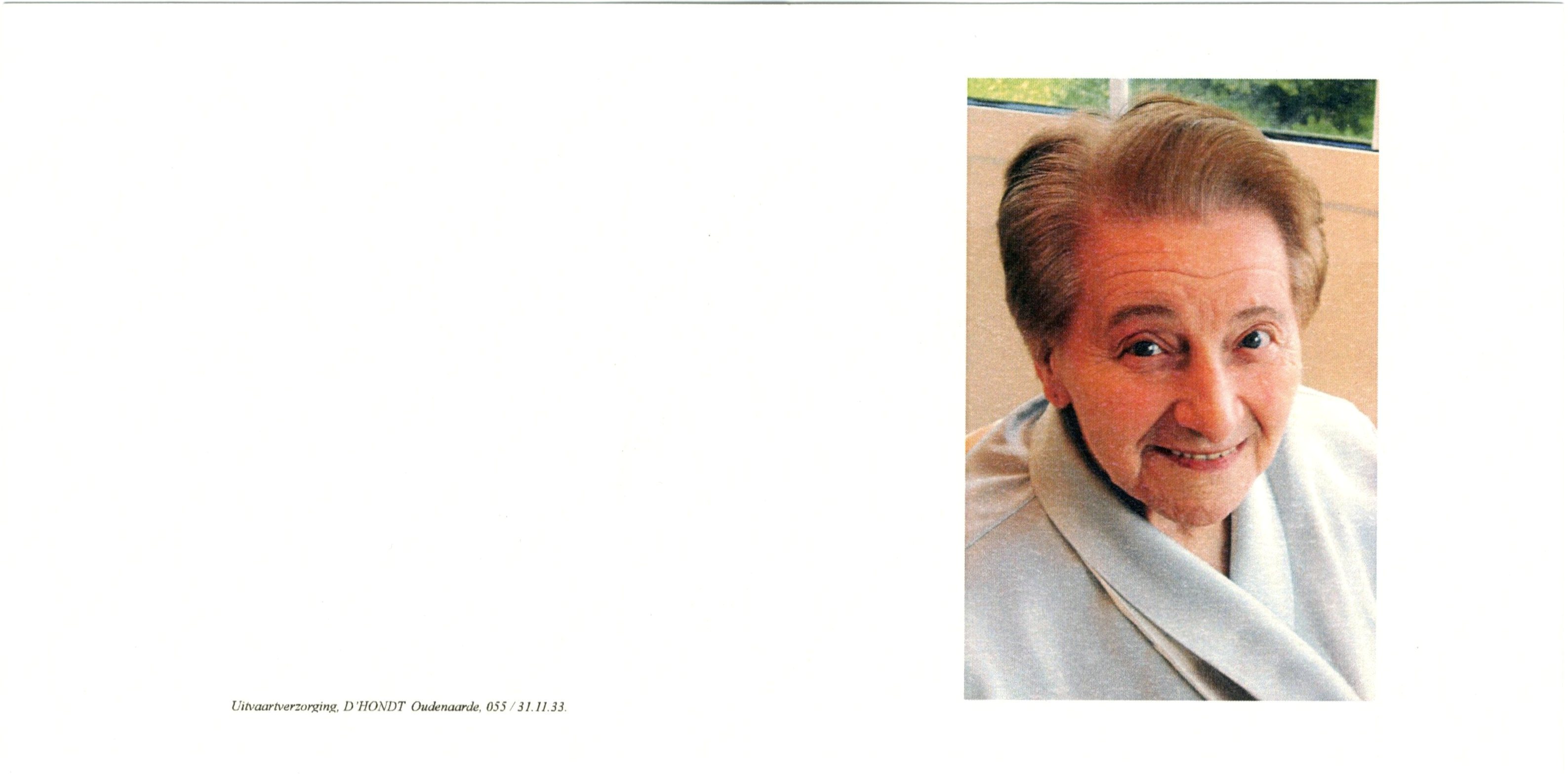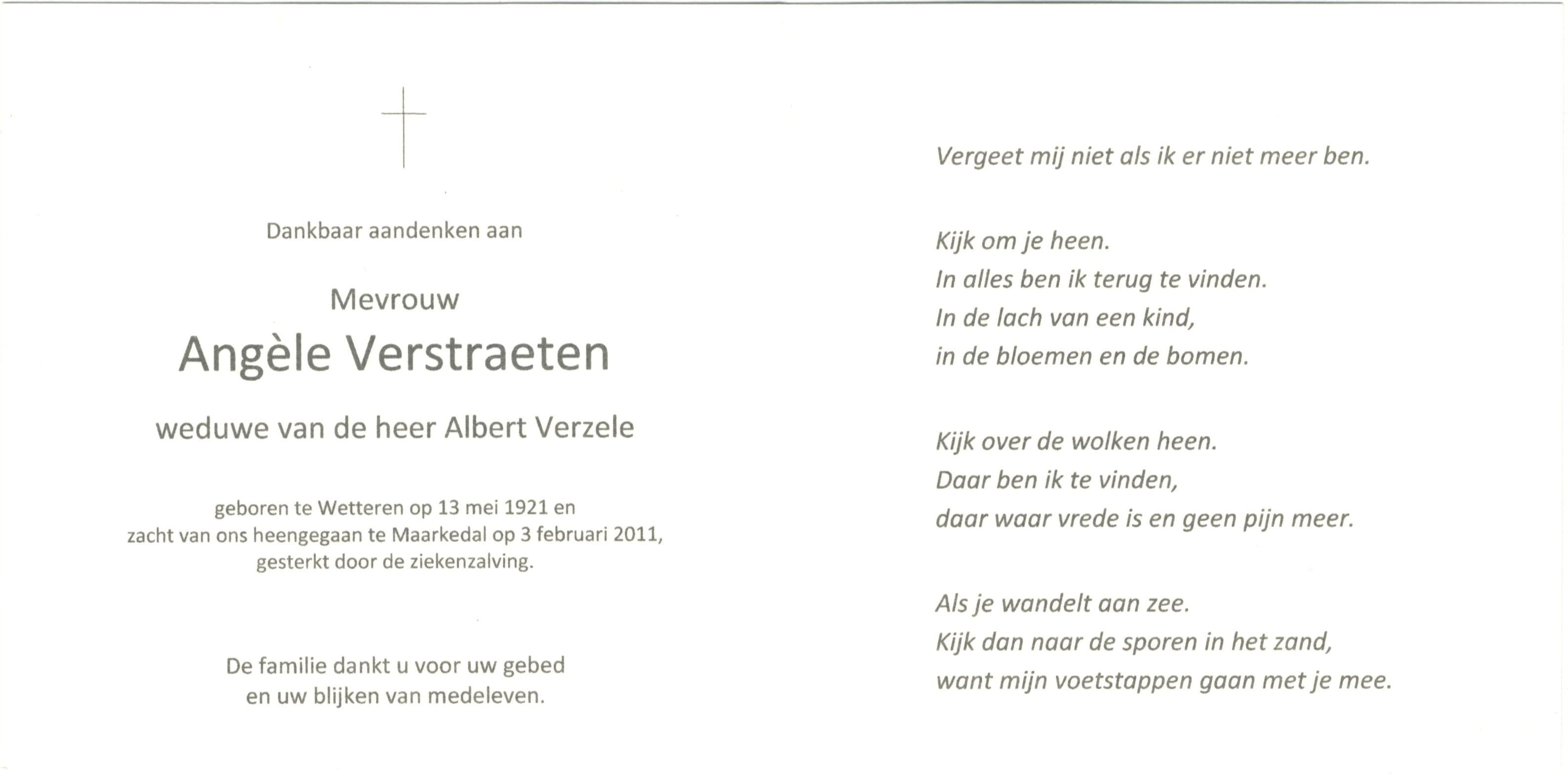 weduwe van de heer Albert Verzelegeboren te Wetteren op 13 mei 1921 enzacht van ons heengegaan te Maarkedal op 3 februari 2011.