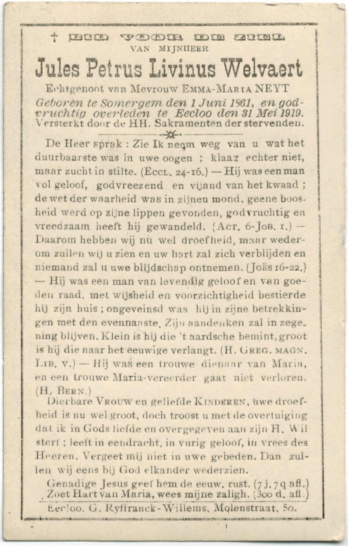 en godvruchtig overleden te Eecloo den 31 Mei 1919.