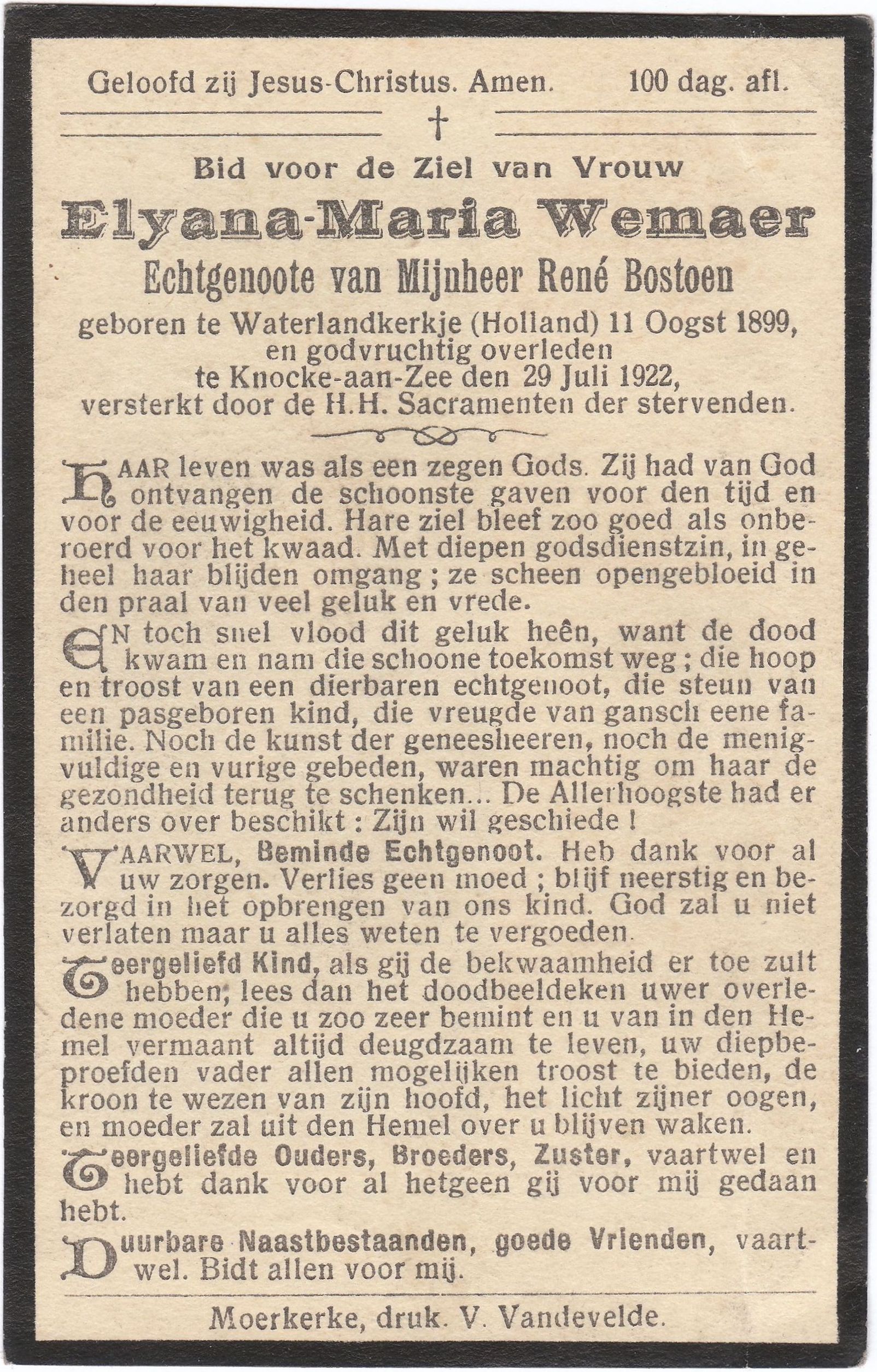 en godvruchtig overleden te Knocke-aan-Zee den 29 Juli 1922.
