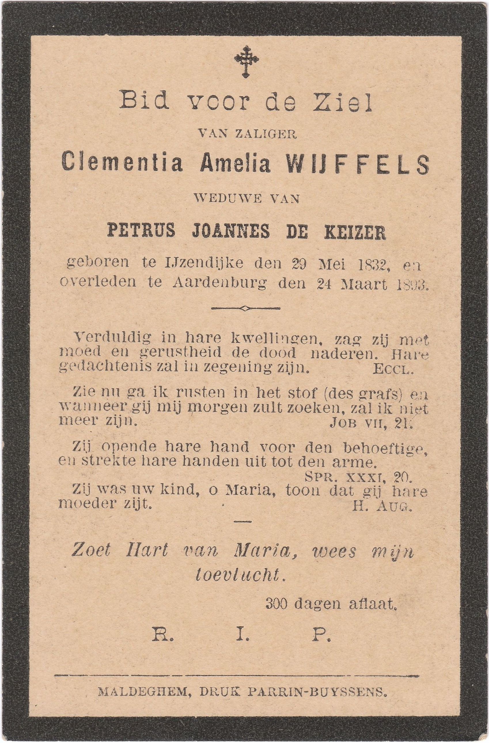 weduwe van Petrus Joannes De Keizergeboren te IJzendijke den 29 Mei 1832,en overleden te Aardenburg den 24 Maart 1893.