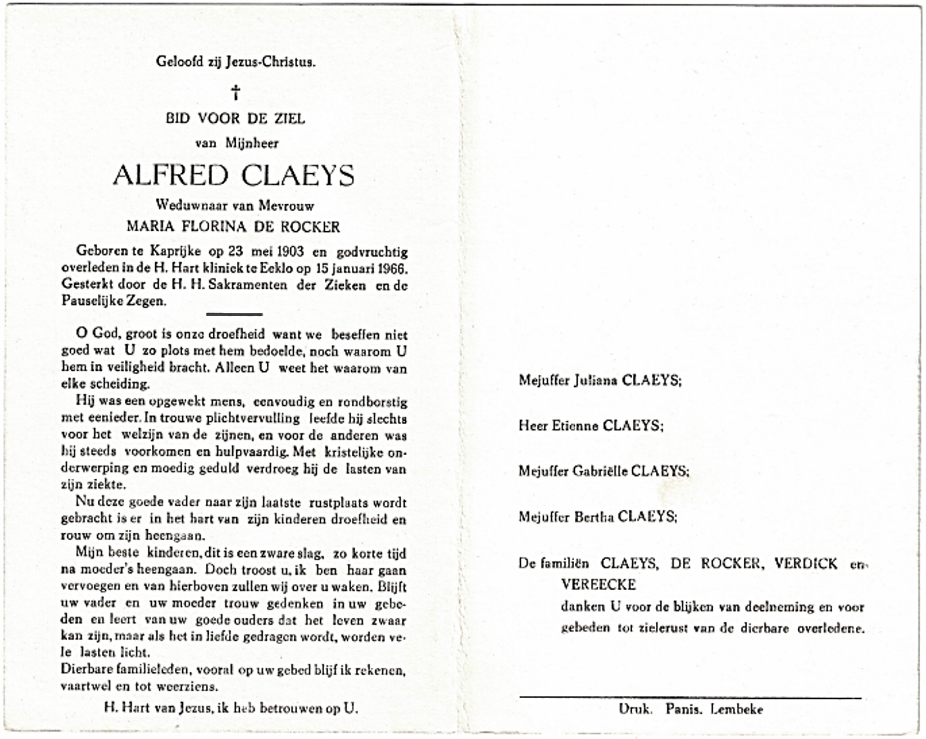 Florina overleed daar op 30-9-1964 na een lange ziekte. En een goed jaar later op 15-1-1966 stierf ook Alfred in het Heilig Hart Ziekenhuis te Eeklo.