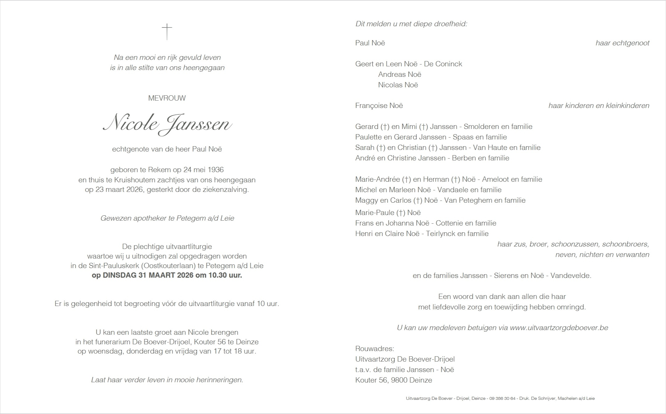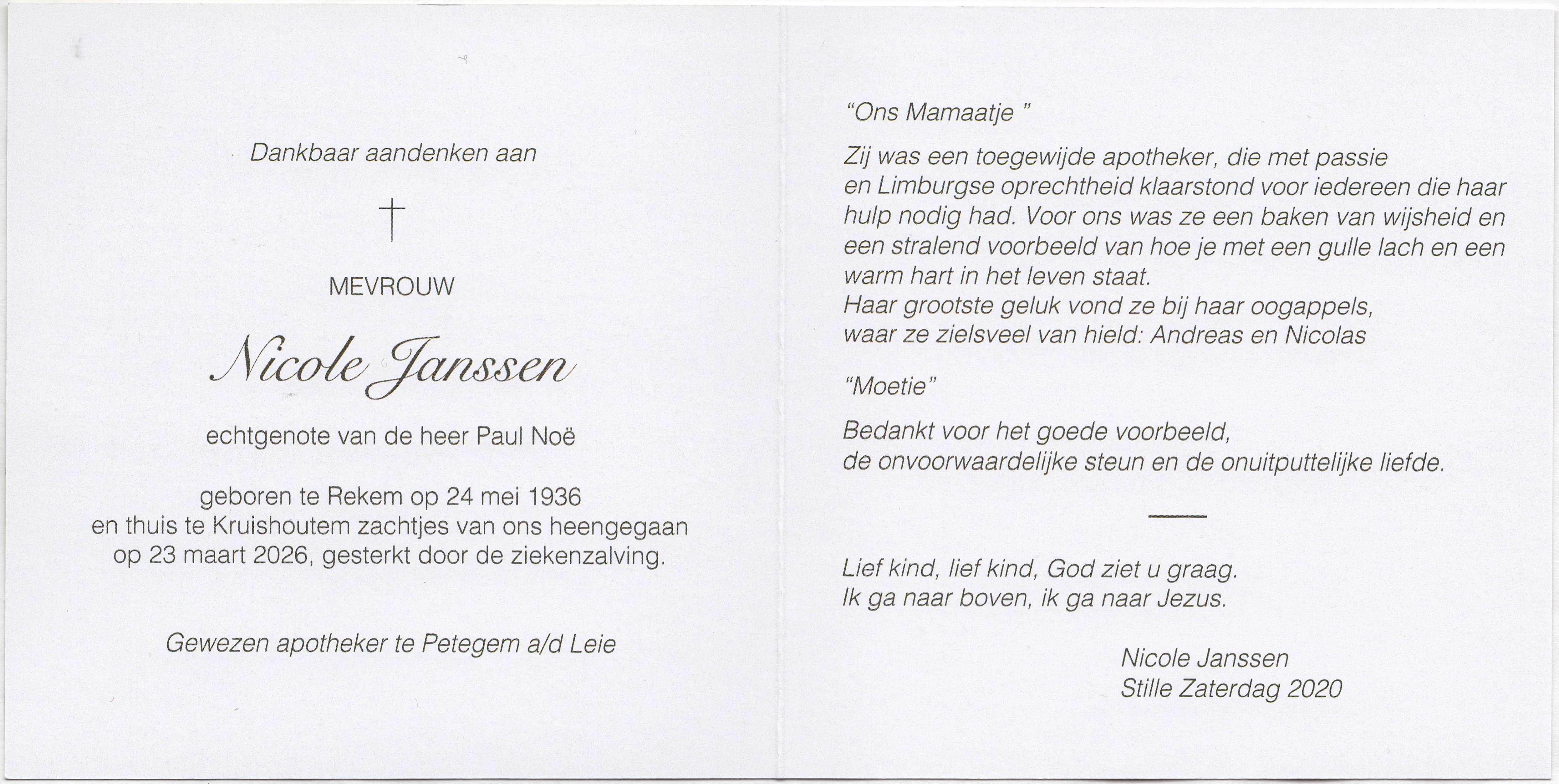 Janssen, Nicole (Rekem 24/5/1936 - Kruishoutem 23/3/2026) e. Noë, Paul