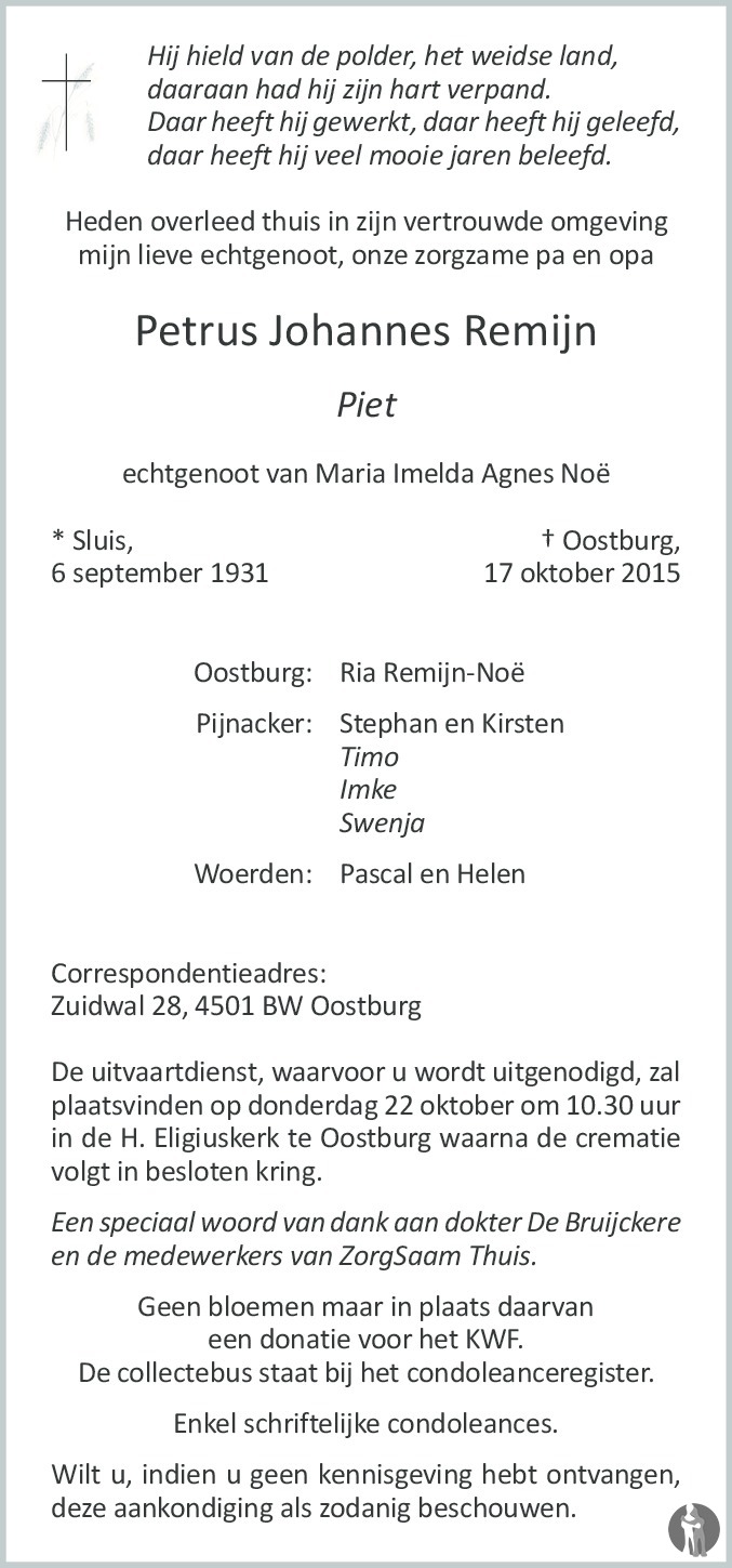 Remijn, Petrus Johannes (Sluis 6/9/1931 - Oostburg 17/10/2015) e. Noë, Maria Imelda Agnes