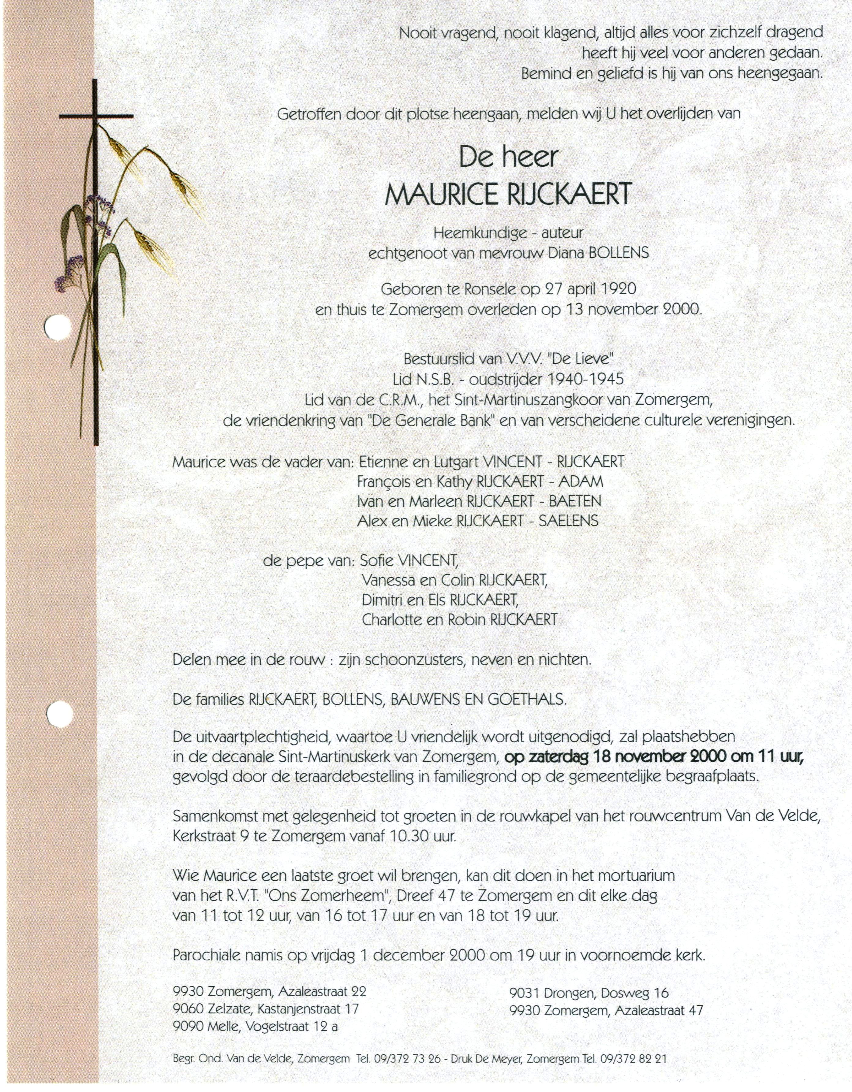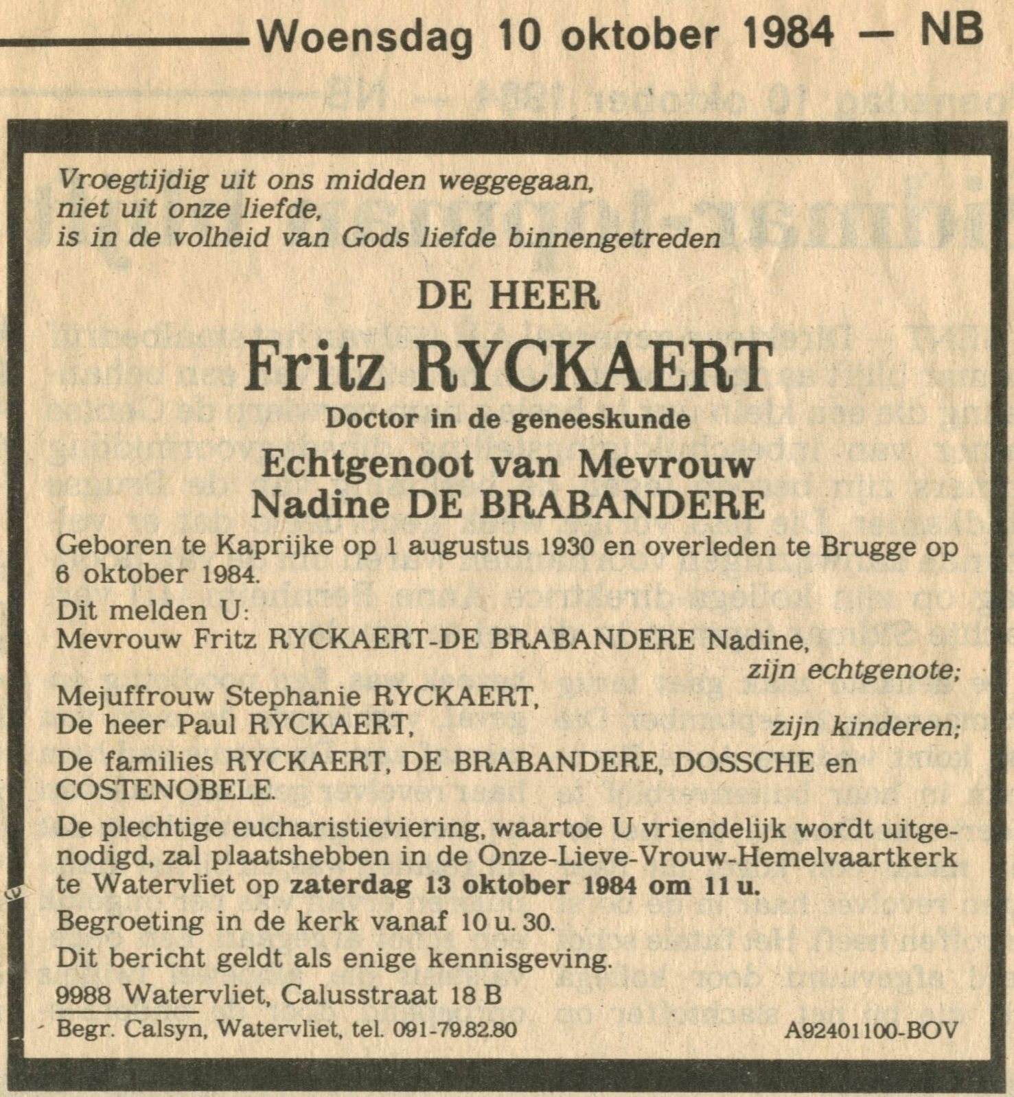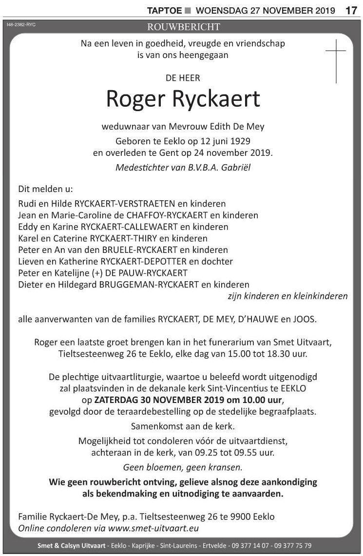 Ryckaert, Roger (Ronsele 28/9/1924 - 14/12/1985) w. Vandewalle, Helena; e. Flement, Renata