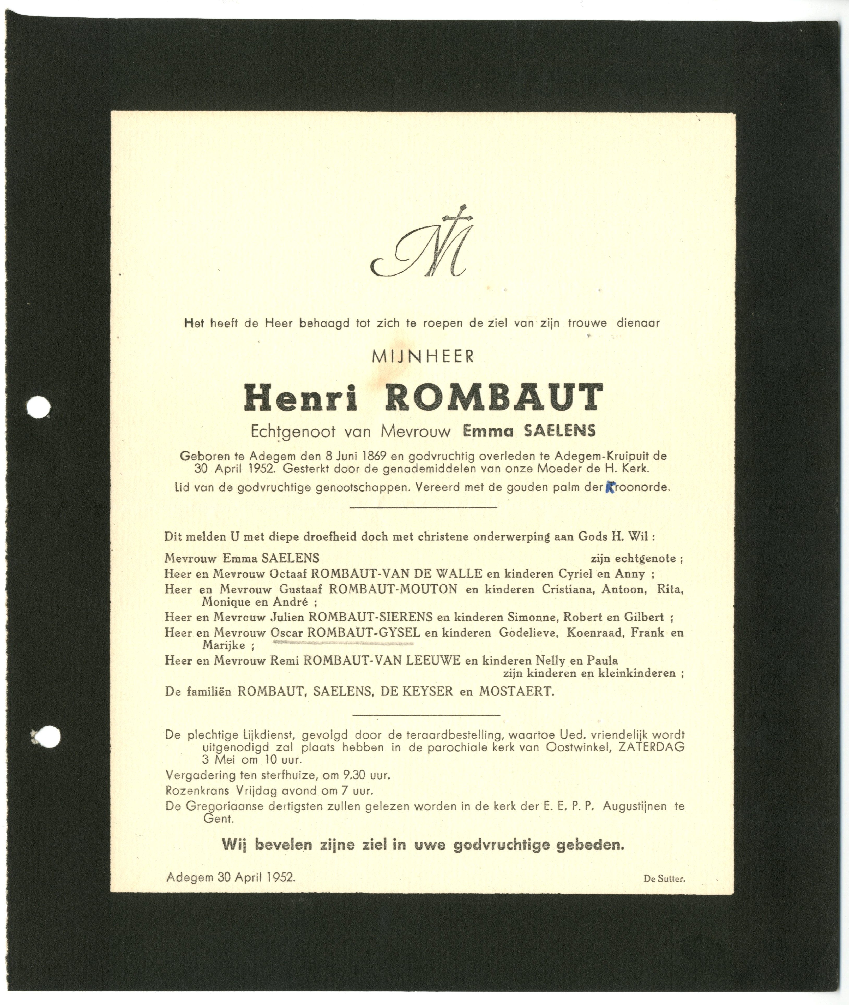 Ryckaert, Henri (Adegem 16/4/1886 - Ronsele 15/10/1950) w. Bauwens, Leonie