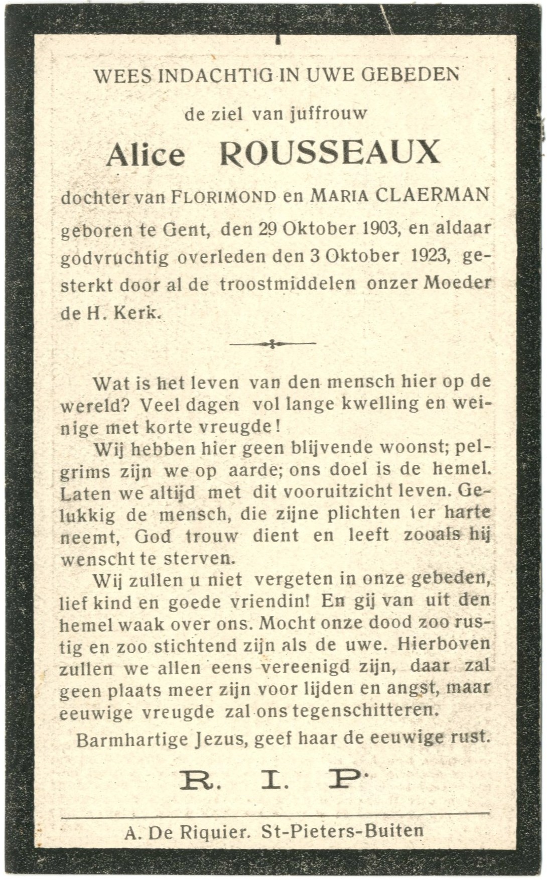 Ryckaert, Irma Virginia (Boekhoute 13/10/1892 - Eeklo 8/2/1966) w. Dhuyvetter, Clement
