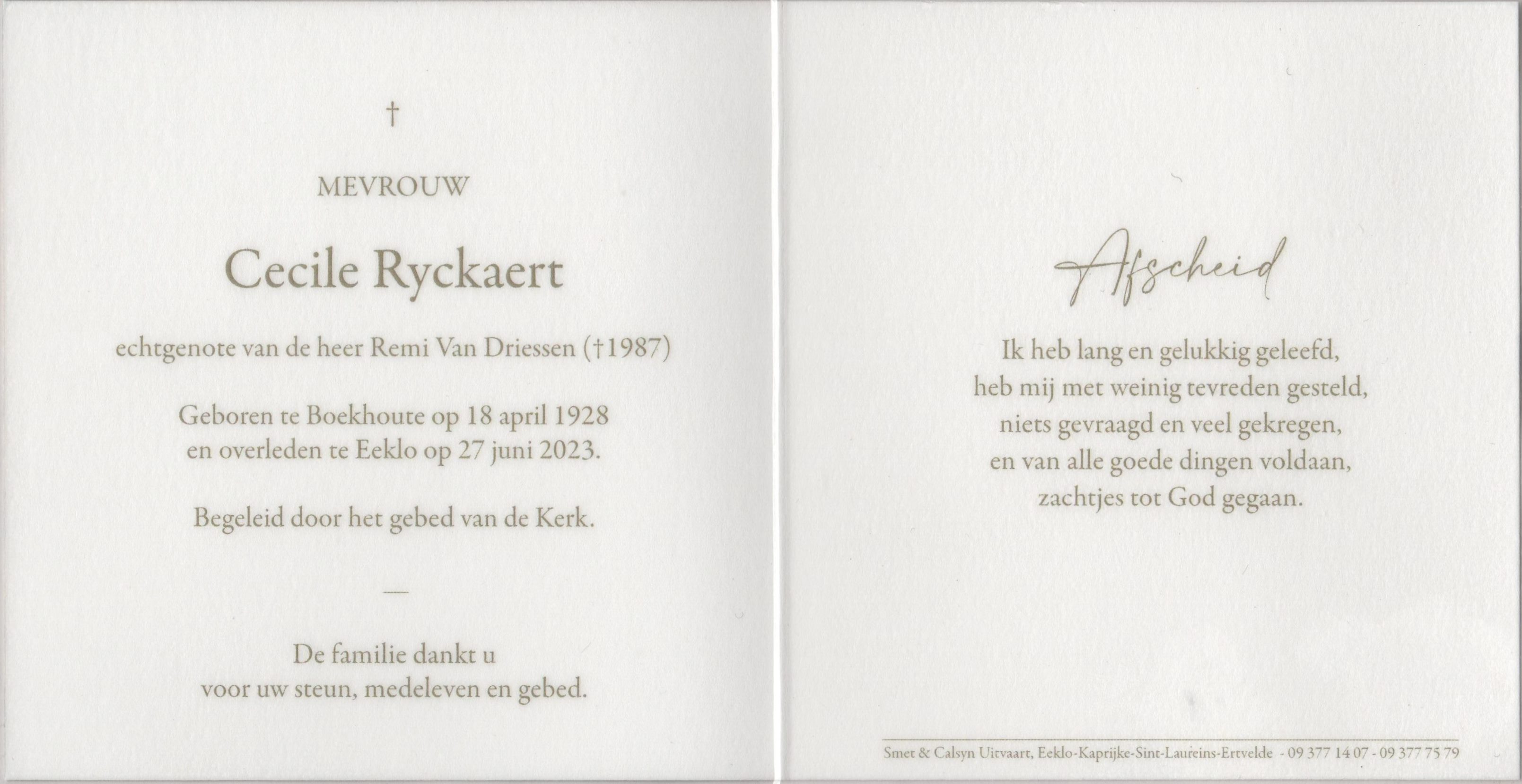 Ryckaert, Roger (Eeklo 12/6/1929 - Gent 24/11/2019) w. De Mey, Edith