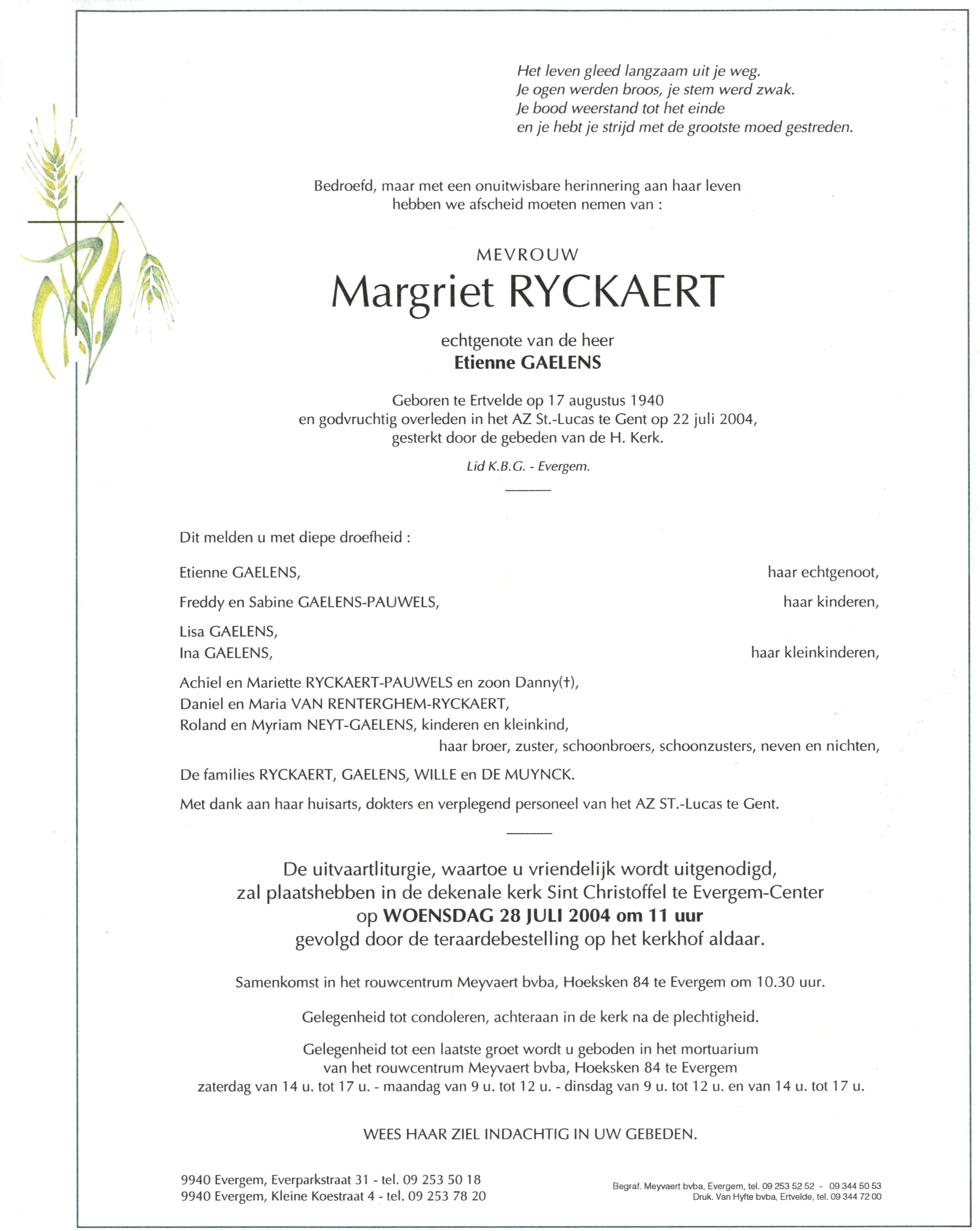 Ryckaert, Margriet (Ertvelde 17/8/1940 - Gent 22/7/2004) e. Gaelens, Etienne