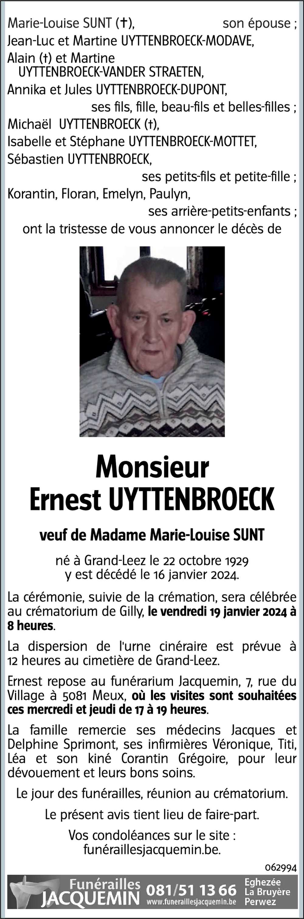 Uyttenbroeck, Ernest (Grand-Leez 22/10/1929 - id 16/1/2024) w. Sunt, Marie-Louise