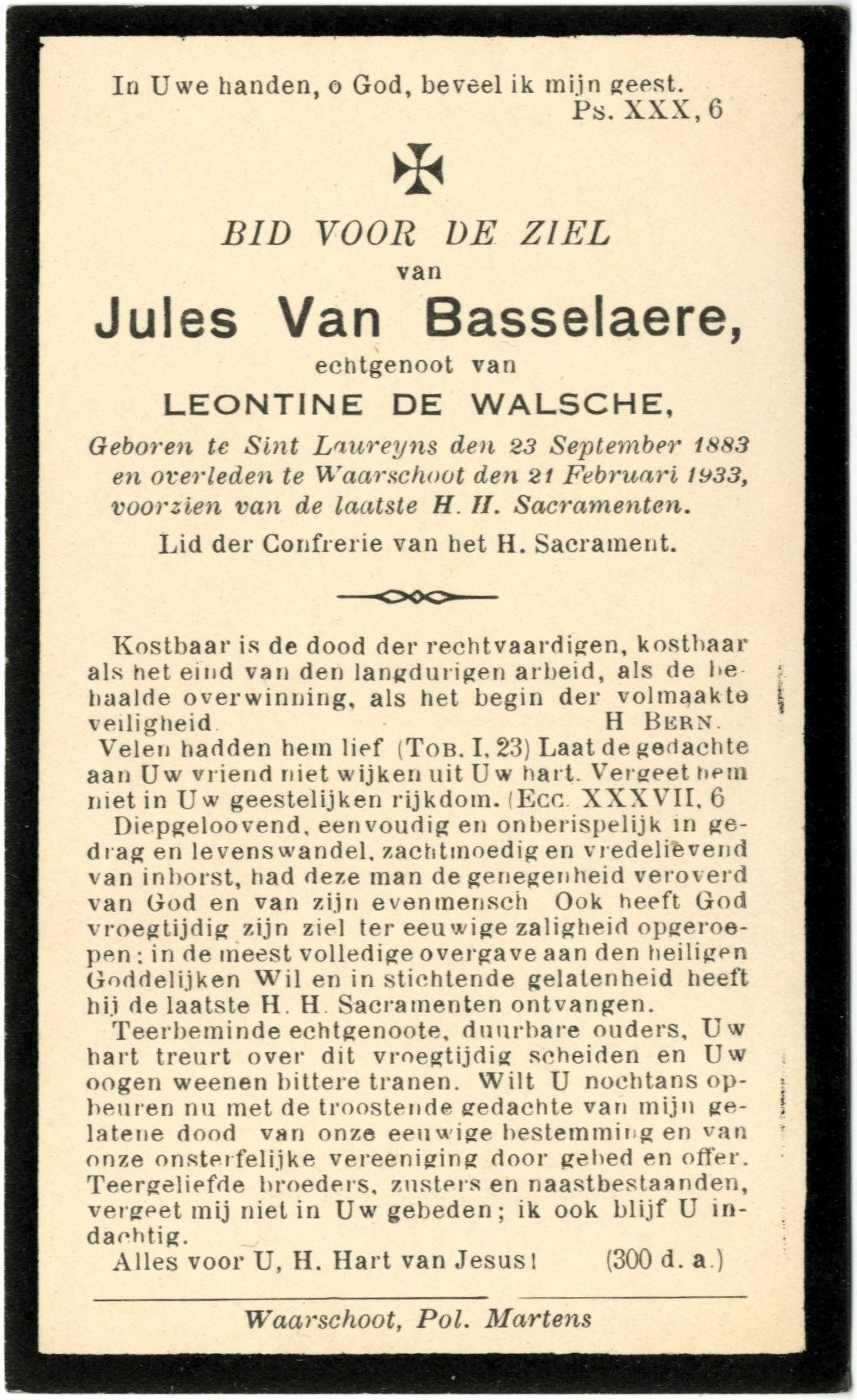 Van Basselaere, Jules (St Laureyns 23/9/1883 - Waarschoot 21/2/1933) e. De Walsche, Leontine