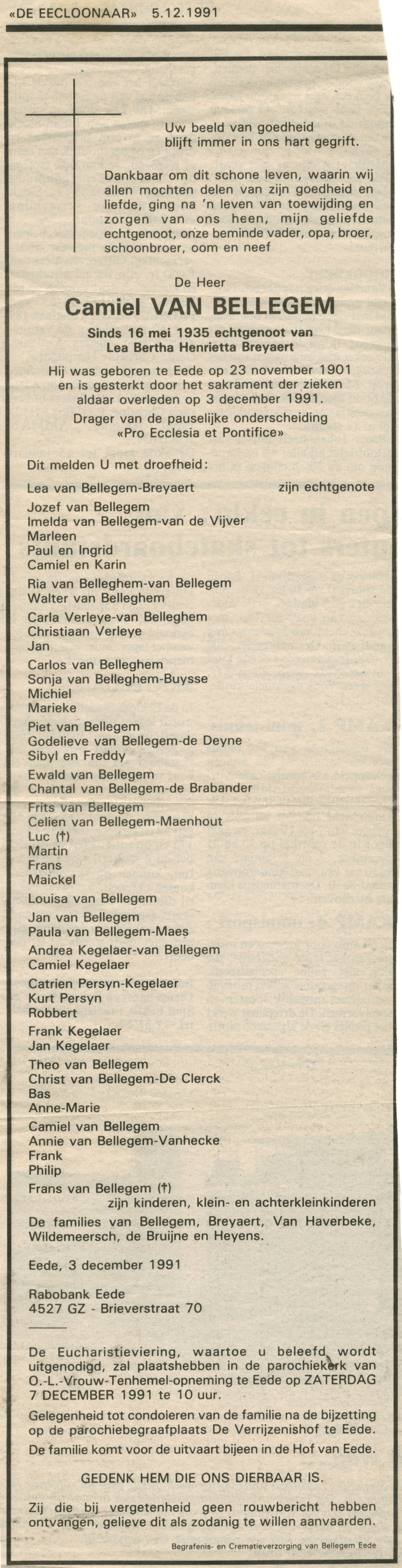 Van de Wijnckel, Arseen Firmin (St.-Jan-in-Eremo 18/9/1917 - Eeklo 13/4/1990) w. Heyde, Julia