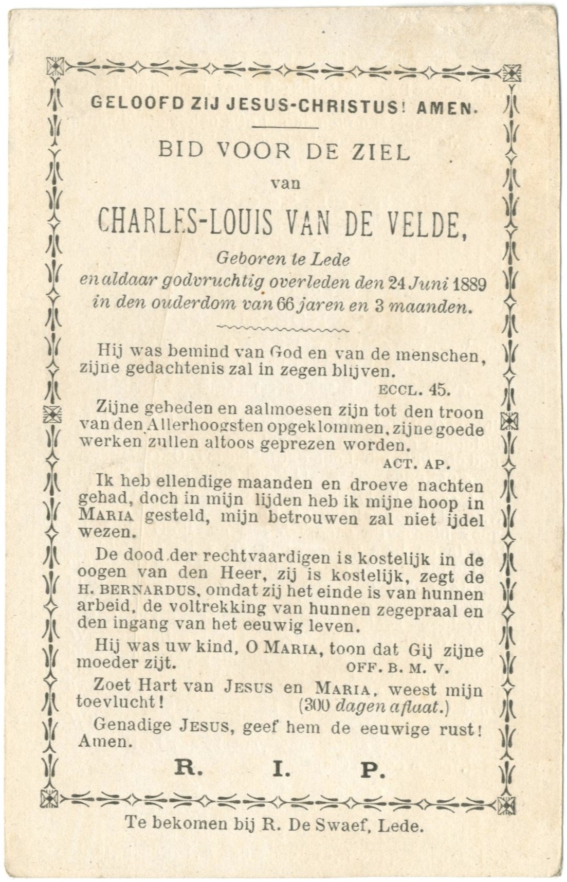 Van De Weghe, Victor (Somerghem 17/4/1846 - id 3/7/1898) w. Van Overbeke, Mathilde; e. Heyde, Joanna Marie